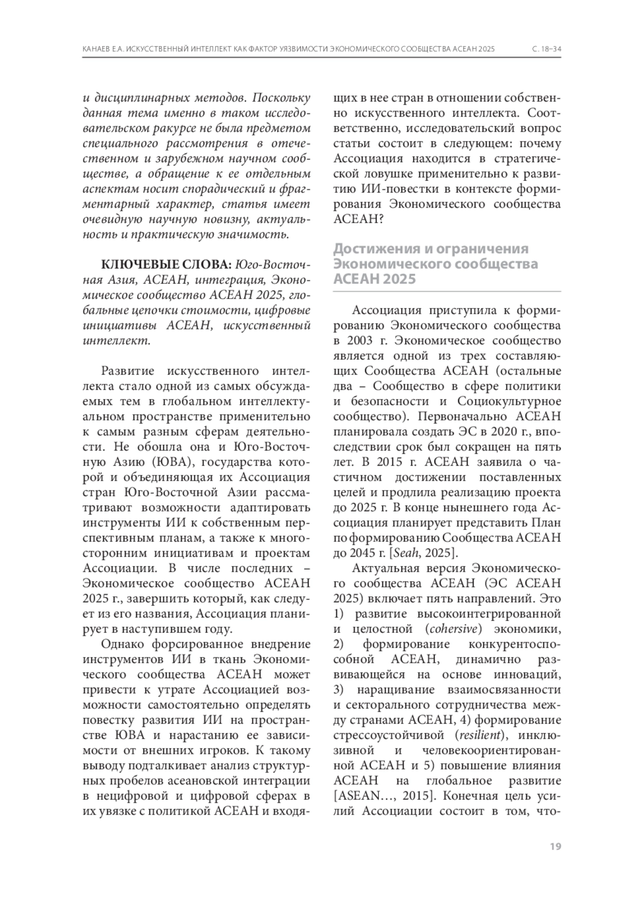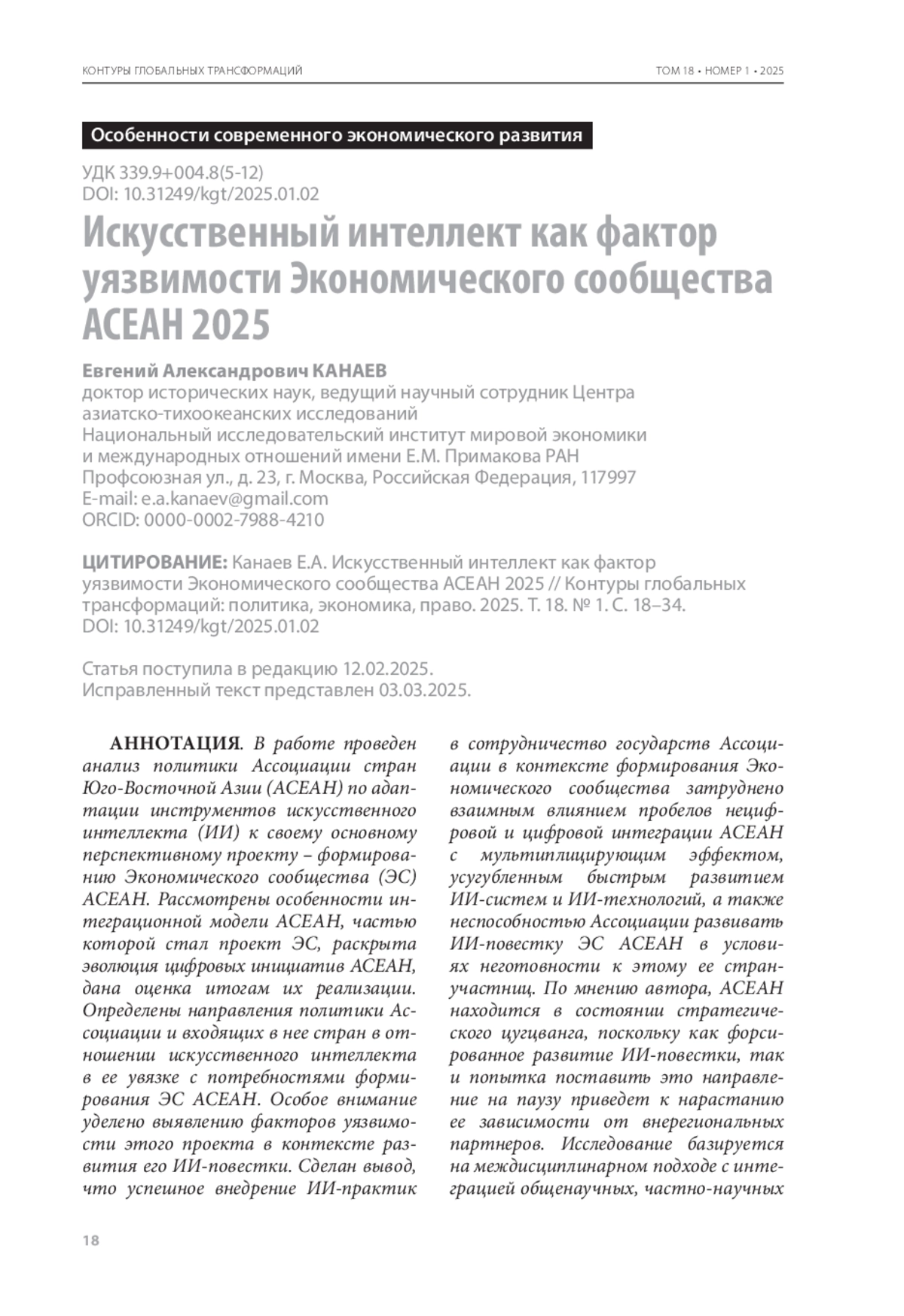В работе проведен анализ политики Ассоциации стран Юго-Восточной Азии (АСЕАН) по адаптации инструментов искусственного интеллекта (ИИ) к своему основному перспективному проекту – формированию Экономического сообщества (ЭС) АСЕАН. Рассмотрены особенности интеграционной модели АСЕАН, частью которой стал проект ЭС, раскрыта эволюция цифровых инициатив АСЕАН, дана оценка итогам их реализации. Определены направления политики Ассоциации и входящих в нее стран в отношении искусственного интеллекта в ее увязке с потребностями формирования ЭС АСЕАН. Особое внимание уделено выявлению факторов уязвимости этого проекта в контексте развития его ИИ-повестки. Сделан вывод, что успешное внедрение ИИ-практик в сотрудничество государств Ассоциации в контексте формирования Экономического сообщества затруднено взаимным влиянием пробелов нецифровой и цифровой интеграции АСЕАН с мультиплицирующим эффектом, усугубленным быстрым развитием ИИ-систем и ИИ-технологий, а также неспособностью Ассоциации развивать ИИ-повестку ЭС АСЕАН в условиях неготовности к этому ее стран-участниц. По мнению автора, АСЕАН находится в состоянии стратегического цугцванга, поскольку как форсированное развитие ИИ-повестки, так и попытка поставить это направление на паузу приведет к нарастанию ее зависимости от внерегиональных партнеров. Исследование базируется на междисциплинарном подходе с интеграцией общенаучных, частно-научных и дисциплинарных методов. Поскольку данная тема именно в таком исследовательском ракурсе не была предметом специального рассмотрения в отечественном и зарубежном научном сообществе, а обращение к ее отдельным аспектам носит спорадический и фрагментарный характер, статья имеет очевидную научную новизну, актуальность и практическую значимость.