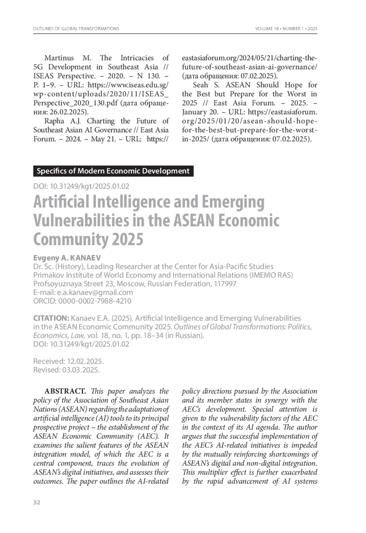 9. Kanaev E., Fedorenko D. Digital Trans-Boundary Initiatives of the ASEAN Economic Community as a Tool for the Development of Singapore’s Economy// Contemporary World Economy. - 2024. - Vol. 2, N 1. - P. 79-99. - https://doi.org/10.17323/2949-5776-2024-2-1-83-104.
