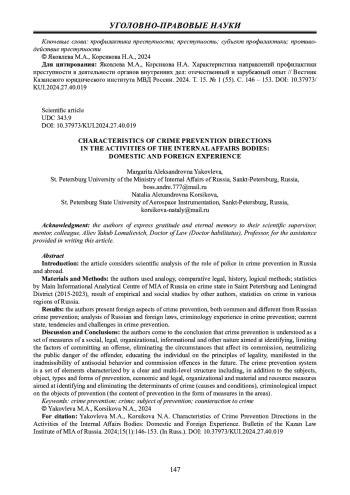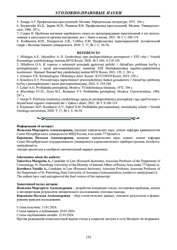 1. Шалагин А.Е., Идиятуллов А.Д. Зарубежный опыт предупреждения преступности в XXI веке // Вестник Казанского юридического института МВД России. 2020. № 2 (40). С.119-129. EDN: KWRFMW