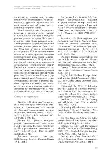 2. Дёмина Я.В. Процессы международной экономической интеграции в АТР и интересы России: итоги 25 лет // Пространственная экономика. - 2017. - № 2. - С. 16-40. - https://doi.org/10.14530/se.2017.2.016-040.