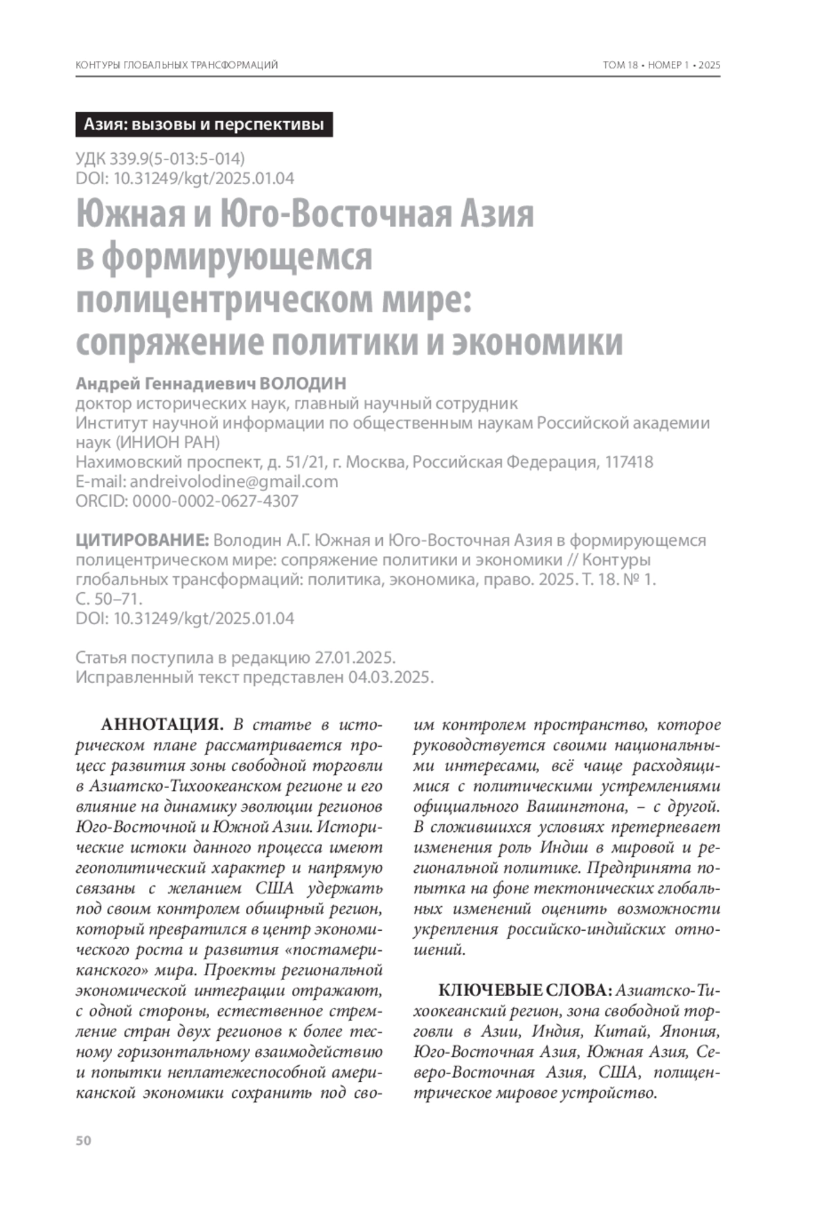 В статье в историческом плане рассматривается процесс развития зоны свободной торговли в Азиатско-Тихоокеанском регионе и его влияние на динамику эволюции регионов Юго-Восточной и Южной Азии. Исторические истоки данного процесса имеют геополитический характер и напрямую связаны с желанием США удержать под своим контролем обширный регион, который превратился в центр экономического роста и развития «постамериканского» мира. Проекты региональной экономической интеграции отражают, с одной стороны, естественное стремление стран двух регионов к более тесному горизонтальному взаимодействию и попытки неплатежеспособной американской экономики сохранить под своим контролем пространство, которое руководствуется своими национальными интересами, всё чаще расходящимися с политическими устремлениями официального Вашингтона, - с другой. В сложившихся условиях претерпевает изменения роль Индии в мировой и региональной политике. Предпринята попытка на фоне тектонических глобальных изменений оценить возможности укрепления российско-индийских отношений.