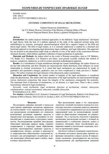 Введение: в статье проанализированы доктринальные подходы, выработанные теорией права к дефиниции «правовые механизмы». Установлено отсутствие единообразного подхода при исследовании анализируемого понятия с использованием таких методологий, как системная, аксиологическая, феноменологическая, что негативно отражается на отраслевых и теоретико-правовых исследованиях. Последнее выражается в структурной и функциональной составляющей при исследовании правовых явлений, правовых состояний, феноменов и правовых образований, уделяющих недостаточное внимание рассмотрению изучаемых явлений как целостных образований, с учетом характера взаимосвязей между структурными элементами, что определяет качественную характеристику и правовых механизмов в том числе.