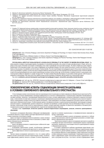 СЕРДЮКОВА Е. Ф., КАПУРА Е. Н., ДЖЕГИСТАЕВА Л. И. ПСИХОЛОГИЧЕСКИЕ АСПЕКТЫ СОЦИАЛИЗАЦИИ ЛИЧНОСТИ ШКОЛЬНИКА В УСЛОВИЯХ СОВРЕМЕННОГО ОБРАЗОВАТЕЛЬНОГО ПРОСТРАНСТВА // МИР НАУКИ, КУЛЬТУРЫ, ОБРАЗОВАНИЯ. 2025. № 1 (110)