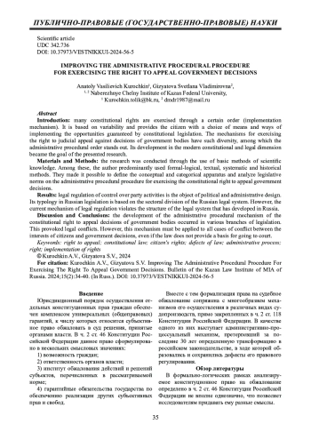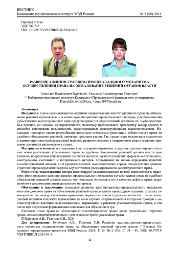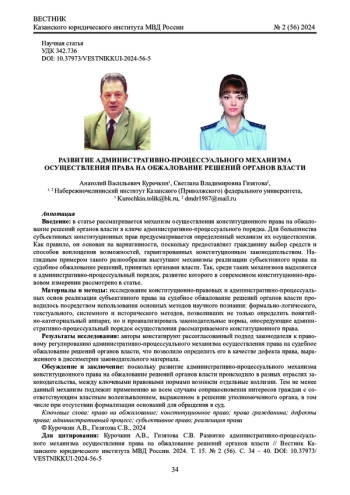 Статья: РАЗВИТИЕ АДМИНИСТРАТИВНО-ПРОЦЕССУАЛЬНОГО МЕХАНИЗМА ОСУЩЕСТВЛЕНИЯ ПРАВА НА ОБЖАЛОВАНИЕ РЕШЕНИЙ ОРГАНОВ ВЛАСТИ (2024)