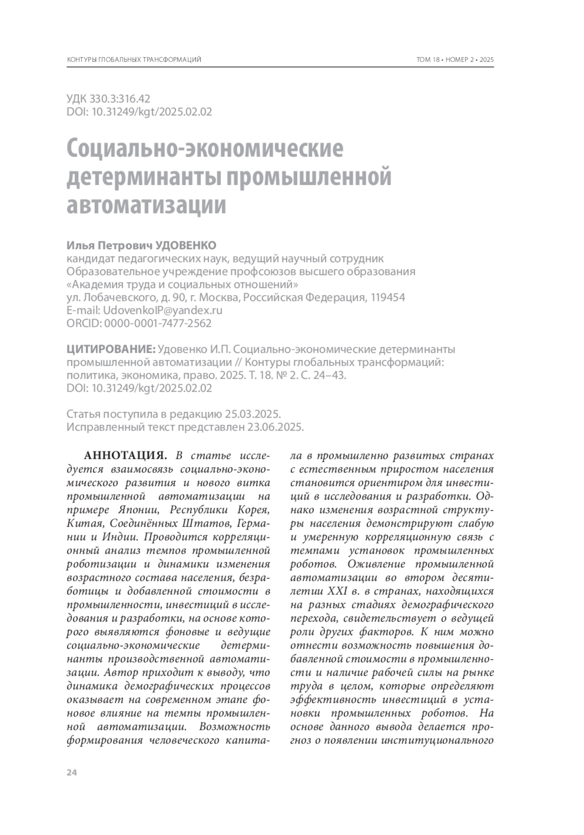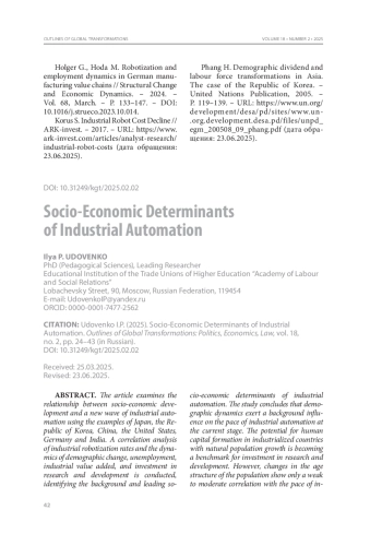 В статье исследуется взаимосвязь социально-экономического развития и нового витка промышленной автоматизации на примере Японии, Республики Корея, Китая, Соединённых Штатов, Германии и Индии. Проводится корреляционный анализ темпов промышленной роботизации и динамики изменения возрастного состава населения, безработицы и добавленной стоимости в промышленности, инвестиций в исследования и разработки, на основе которого выявляются фоновые и ведущие социально-экономические детерминанты производственной автоматизации. Автор приходит к выводу, что динамика демографических процессов оказывает на современном этапе фоновое влияние на темпы промышленной автоматизации. Возможность формирования человеческого капитала в промышленно развитых странах с естественным приростом населения становится ориентиром для инвестиций в исследования и разработки. Однако изменения возрастной структуры населения демонстрируют слабую и умеренную корреляционную связь с темпами установок промышленных роботов. Оживление промышленной автоматизации во втором десятилетии XXI в. в странах, находящихся на разных стадиях демографического перехода, свидетельствует о ведущей роли других факторов. К ним можно отнести возможность повышения добавленной стоимости в промышленности и наличие рабочей силы на рынке труда в целом, которые определяют эффективность инвестиций в установки промышленных роботов. На основе данного вывода делается прогноз о появлении институционального фактора, повышение значимости которого будет приводить к снижению темпов инвестиций в автоматизацию промышленности.