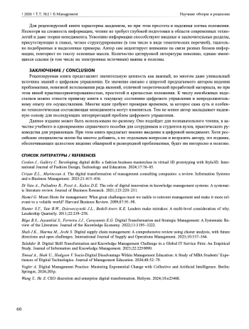 Проблематика цифрового управления обширна и зачастую рассматривается с общетеоретической точки зрения, что делает актуальным проявление хорошо систематизированных практических руководств. Настоящая статья представляет рецензию на свежую и при этом удачную работу, посвященную цифровому управлению. Книга состоит из двух вводных разделов и 12 глав, объединенных в три части. Вопросы, рассматриваемые в рецензируемой работе, касаются процессов цифровизации и их влияния на управленческую деятельность, коллективного интеллекта и возможностей его применения при осуществлении организационного менеджмента, а также искусственного интеллекта, его технологий и перспектив их использования в современном управлении. Настоятельно рекомендуется внедрение этих технологий в рамках пилотных проектов с тестированием их эффективности и последующей донастройкой. Автор книги не концентрируется на сугубо технологических аспектах, а, во-первых, показывает преемственность и взаимосвязь «классического» и цифрового управления и, во-вторых, акцентирует внимание на личности менеджера и новых вызовах для него в условиях цифровизации. Для книги характерна академическая, но при этом простая и хорошо структурированная подача сложного материала. Много конкретики, примеров, рекомендаций. Некоторые аспекты цифрового управления остались вне поля зрения автора, однако такая неполнота неизбежна. Книга может быть полезна специалистам, преподавателям и студентам университетов, а также собственно управленцам.