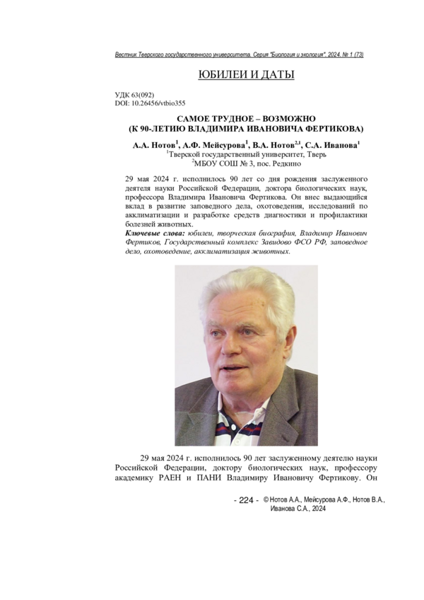29 мая 2024 г. исполнилось 90 лет со дня рождения заслуженного деятеля науки Российской Федерации, доктора биологических наук, профессора Владимира Ивановича Фертикова. Он внес выдающийся вклад в развитие заповедного дела, охотоведения, исследований по акклиматизации и разработке средств диагностики и профилактики болезней животных.