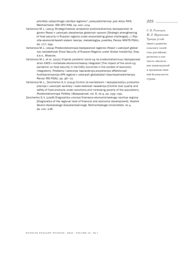 6. Вартанова М. Л. (2022). Влияние пандемии COVID-19 на продовольственную безопасность стран ЕАЭС в контексте экономической интеграции // Проблемы и основные направления повышения эффективности функционирования АПК региона в условиях глобализации импортозамещения: коллективная монография. Пенза: РИО ПГАУ. С. 46-72. EDN: TYXWBC