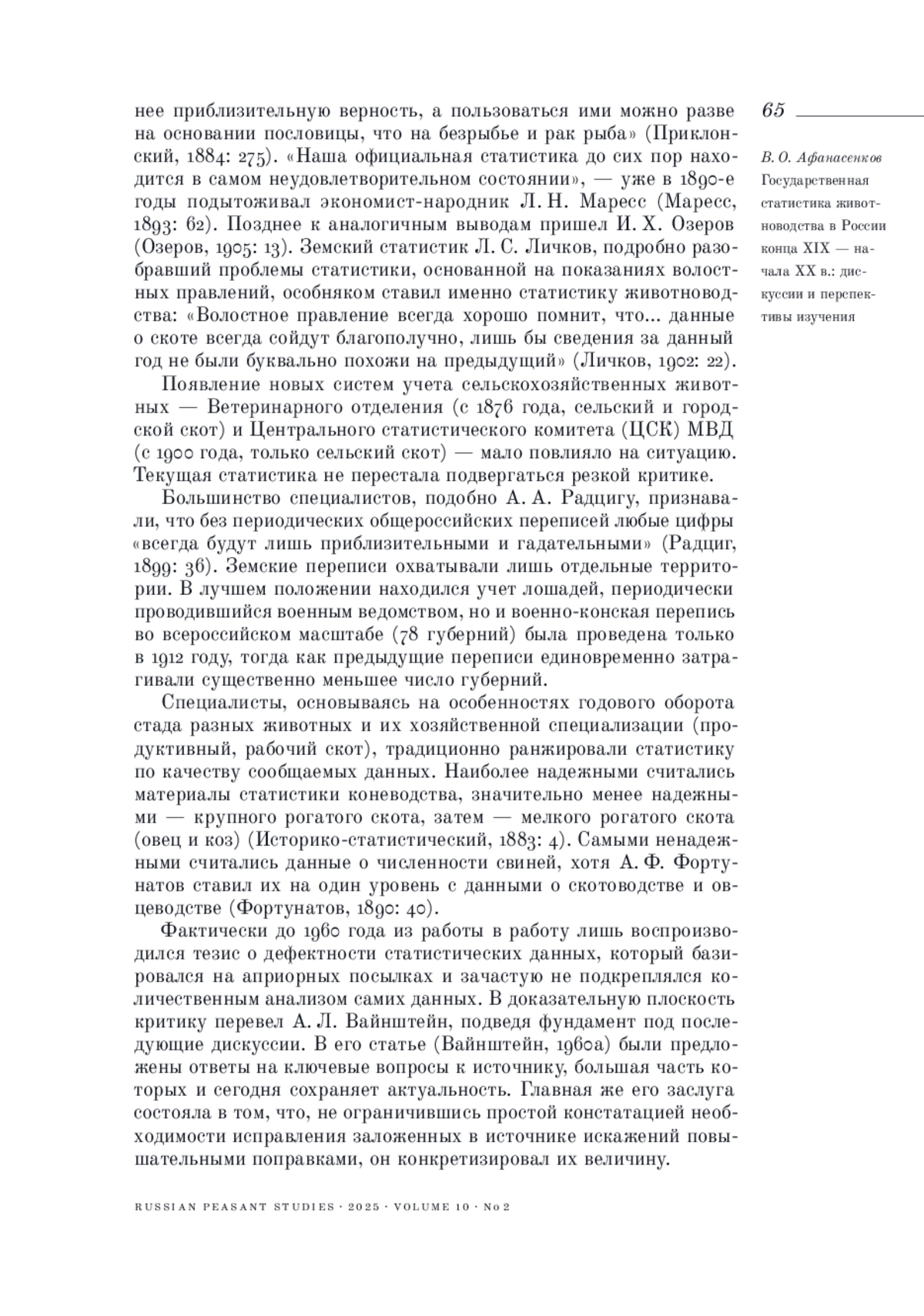 4. Афанасенков В. О. (2023). Статистика животноводства Ветеринарного отделения (управления) МВД: к вопросу о скачкообразном увеличении значений в 1896 г. // Отечественная официальная статистика: прошлое, настоящее, будущее: Сборник материалов Международной научной конференции. М.: Русайнс. С. 11-23. EDN: KBCCWL