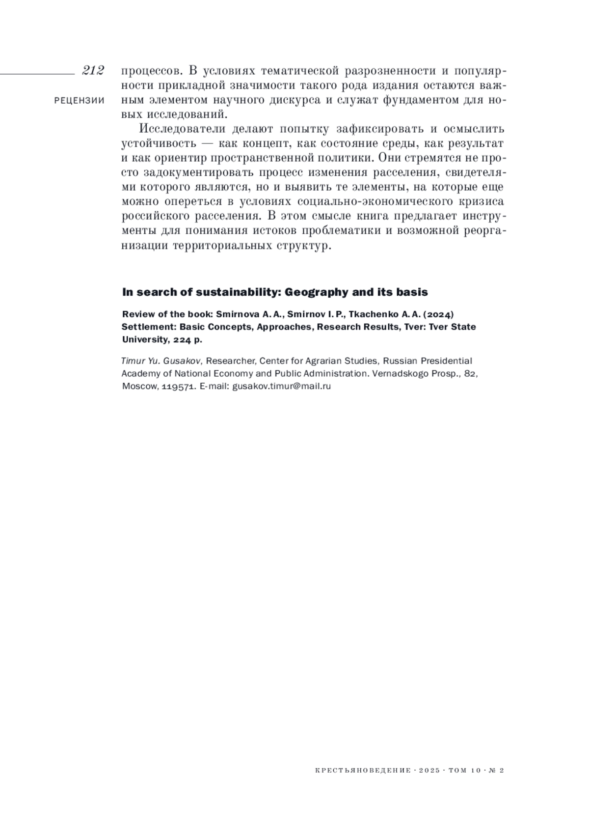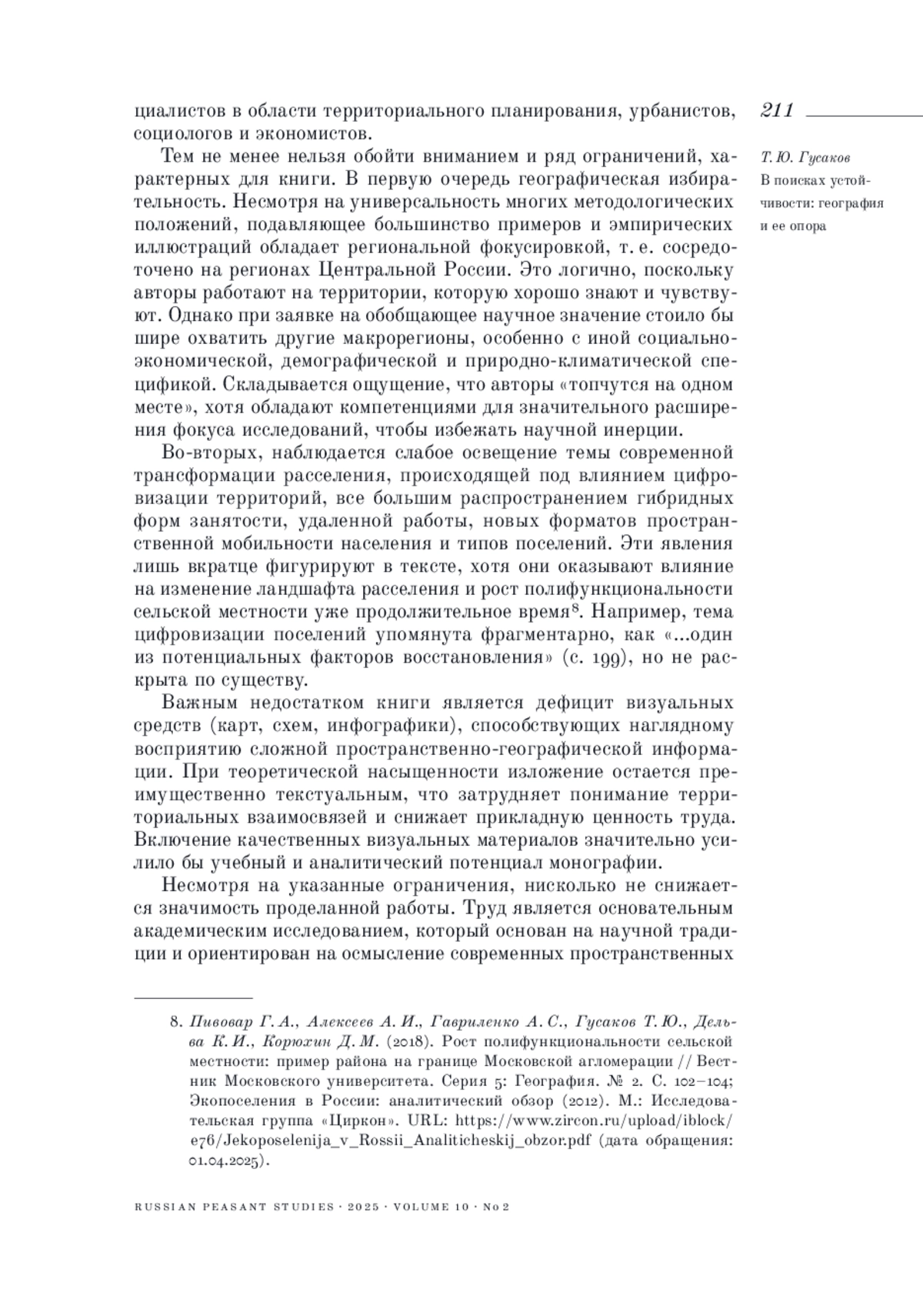ГУСАКОВ Т. Ю. В ПОИСКАХ УСТОЙЧИВОСТИ: ГЕОГРАФИЯ И ЕЕ ОПОРА // КРЕСТЬЯНОВЕДЕНИЕ. 2025. Т. 10 № 2