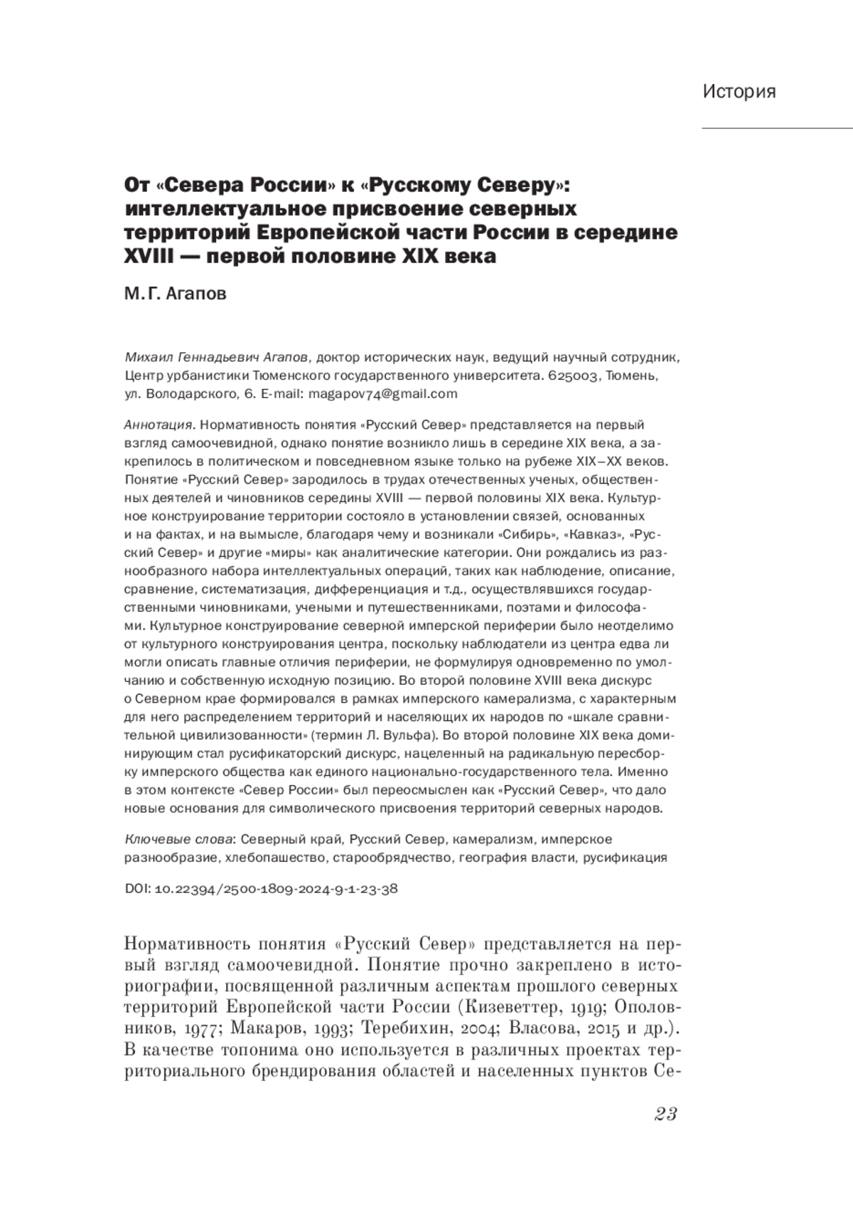 Нормативность понятия «Русский Север» представляется на первый взгляд самоочевидной, однако понятие возникло лишь в середине XIX века, а закрепилось в политическом и повседневном языке только на рубеже XIX-XX веков. Понятие «Русский Север» зародилось в трудах отечественных ученых, общественных деятелей и чиновников середины XVIII - первой половины XIX века. Культурное конструирование территории состояло в установлении связей, основанных и на фактах, и на вымысле, благодаря чему и возникали «Сибирь», «Кавказ», «Русский Север» и другие «миры» как аналитические категории. Они рождались из разнообразного набора интеллектуальных операций, таких как наблюдение, описание, сравнение, систематизация, дифференциация и т. д., осуществлявшихся государственными чиновниками, учеными и путешественниками, поэтами и философами. Культурное конструирование северной имперской периферии было неотделимо от культурного конструирования центра, поскольку наблюдатели из центра едва ли могли описать главные отличия периферии, не формулируя одновременно по умолчанию и собственную исходную позицию. Во второй половине XVIII века дискурс о Северном крае формировался в рамках имперского камерализма, с характерным для него распределением территорий и населяющих их народов по «шкале сравнительной цивилизованности» (термин Л. Вульфа). Во второй половине XIX века доминирующим стал русификаторский дискурс, нацеленный на радикальную пересборку имперского общества как единого национально-государственного тела. Именно в этом контексте «Север России» был переосмыслен как «Русский Север», что дало новые основания для символического присвоения территорий северных народов.