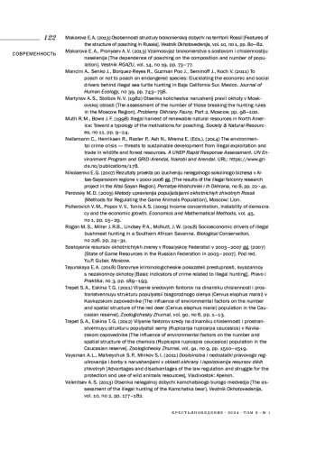 9. Макарова Е. А. (2013). Особенности структуры браконьерской добычи на территории России // Вестник охотоведения. Т. 10. № 1. С. 80-82. EDN: SEAYMB
