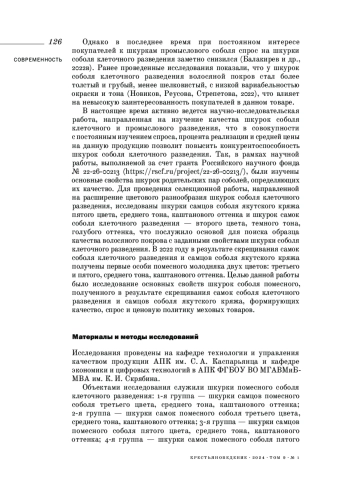 7. Новиков М. В., Реусова Т. В., Стрепетова О. А. (2023). Исследование основных свойств волосяного покрова шкурок соболя клеточного разведения и промыслового // Кролиководство и звероводство. № 3. С. 16-26. EDN: DOIOCA