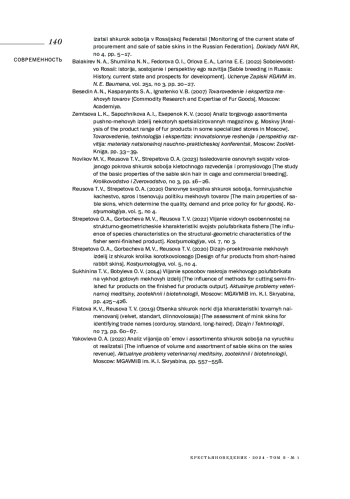 6. Земцова Л. К., Сапожникова А. И., Есепенок К. В. (2020). Анализ торгового ассортимента пушно-меховых изделий некоторых специализированных магазинов г. Москвы // Товароведение, технология и экспертиза: инновационные решения и перспективы развития: материалы национальной научно-практической конференции. М.: ЗооВетКнига. С. 33-39. EDN: CHMRLM