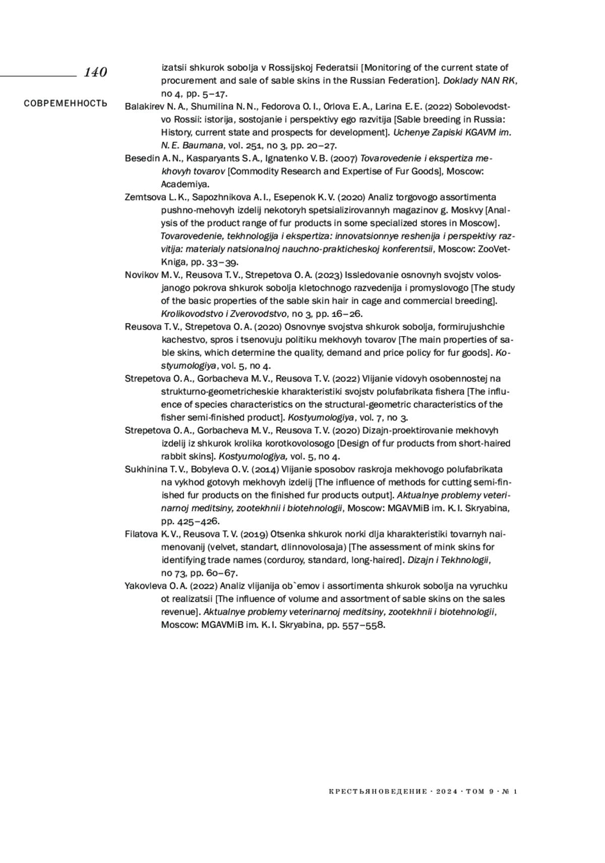 8. Реусова Т. В., Стрепетова О. А. (2020). Основные свойства шкурок соболя, формирующие качество, спрос и ценовую политику меховых товаров // Костюмология. Т. 5. № 4. С. 15. EDN: WOTJOY