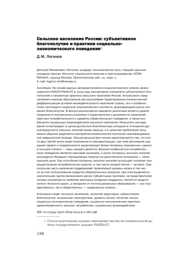 На основе данных репрезентативного социологического опроса, реализованного ИНСАП РАНХиГС в 2023 году, рассмотрены показатели субъективного благополучия и жизненные практики сельского населения России. Актуальность предлагаемого анализа обусловлена как масштабами территориально-поселенческой дифференциации условий жизнедеятельности населения страны, так и особенностями настоящего социально-экономического контекста, формирующими риски снижения благополучия. В фокусе рассмотрения находятся различные аспекты удовлетворенности жизненными условиями и представления о динамике их изменений, практики потребительского и кредитно-сберегательного поведения, а также особенности социальных взаимодействий сельского населения. Результаты исследования иллюстрируют в целом достаточно благополучную ситуацию в отношении удовлетворенности сельских жителей своей жизнью, а в качестве проблемной зоны явным образом выделяется восприятие возможностей получения квалифицированной медицинской помощи. Эмоциональный фон жизни характеризуется тем, что около двух третей селян видят возможности самореализации, при этом регулярное ощущение тревоги и подавленности характеризует более половины опрошенных, однако в сильной степени - лишь каждого десятого. Важной особенностью потребительского поведения является массовая экономия, и около половины сельских жителей вынужденно базируют повседневные покупки на единственном основании - минимальной цене. При этом более половины сельских жителей используют интернет при осуществлении потребительских практик, в том числе каждый пятый - активно. Значительная часть населения поддерживает приемлемый уровень жизни в том числе за счет использования кредитно-сберегательных ресурсов, при этом выделяется значительная группа финансового риска. Субъектными группами, на представителей которых возлагаются наиболее массовые ожидания поддержки, являются представители «близкого круга», а ожидания от институциональных образований - как государственных, так и общественных - кардинально сужены.