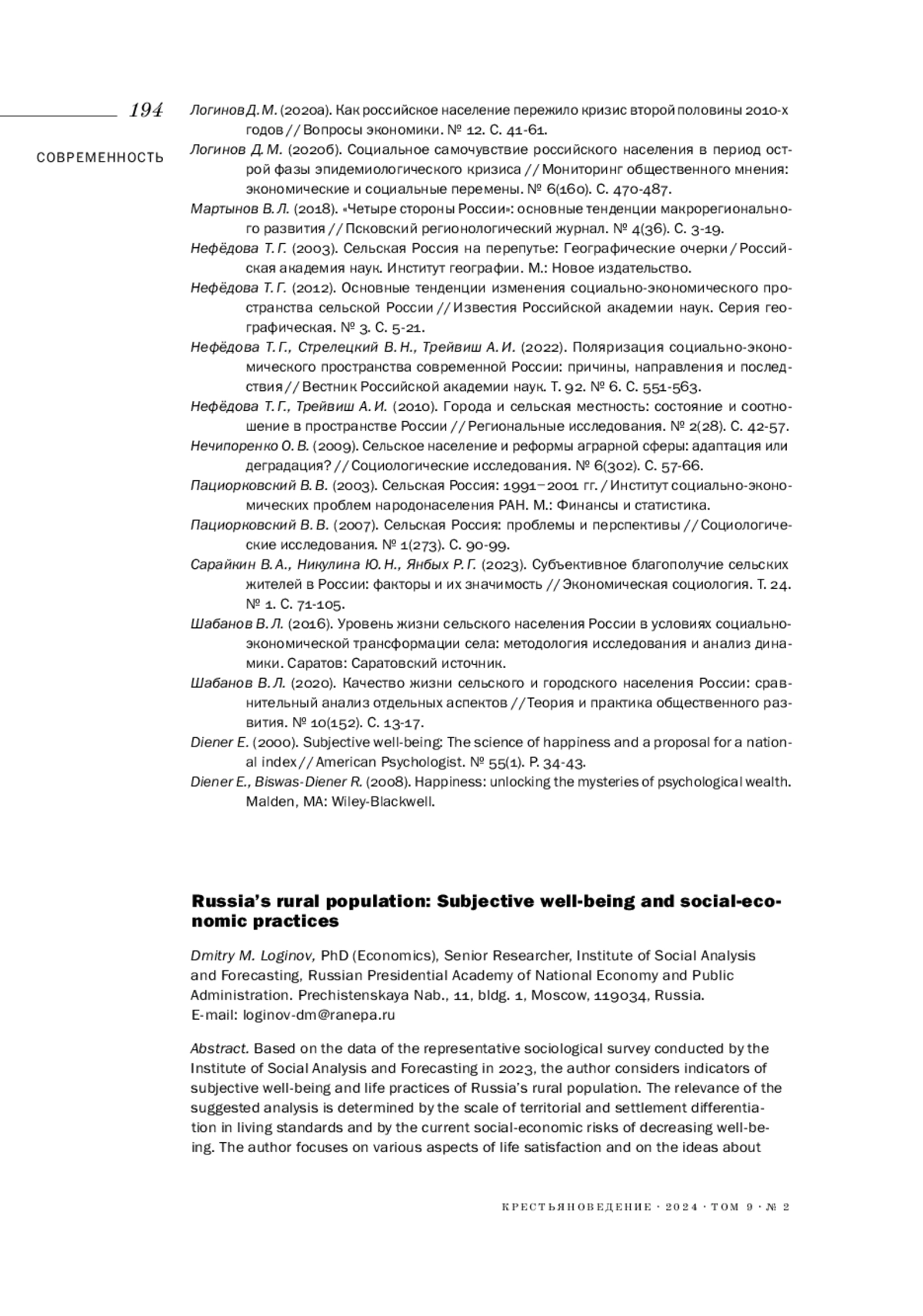 10. Касаткина Н. П. (2023). Удовлетворенность работой и субъективное благополучие жителей села // Социальные нормы и практики. № 3(9). С. 25-35.
