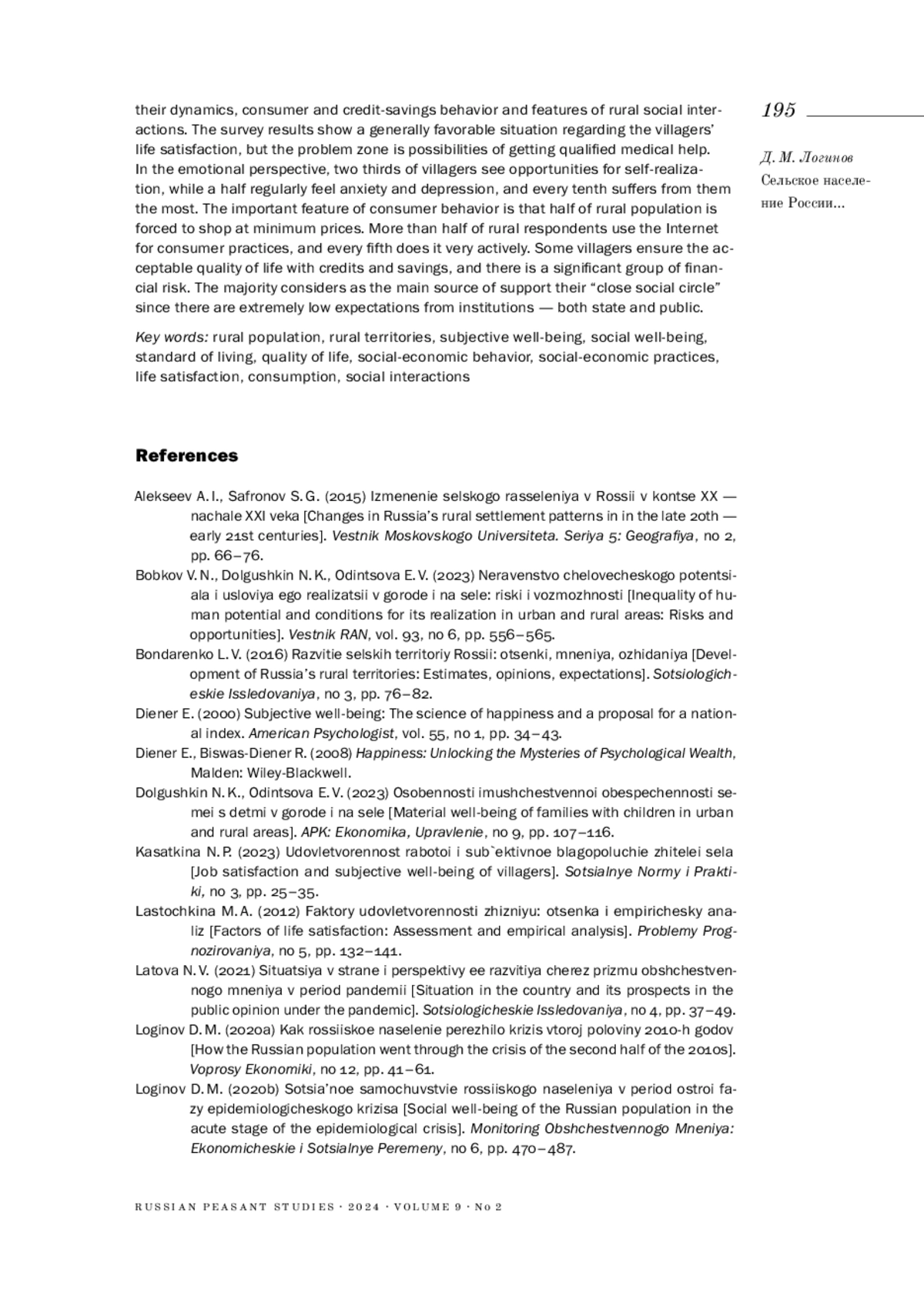 Россия неоднородна: территориально-поселенческие различия, вследствие неравномерности инфраструктурного развития, традиционно являются крайне значимыми с точки зрения возможностей реализации продуктивных жизненных практик. Первая половина 2020-х годов оказалась периодом многоаспектной нестабильности, последствия которой ощутимы для всех социально-демографических групп населения, но проявляются для каждой из них в разной степени. Особенности жизнедеятельности россиян, проживающих в сельской местности, очевидно, актуализируют рассмотрение этой группы в качестве объекта исследования. Насколько высок уровень субъективного благополучия сельского населения страны? Какие проблемы являются наиболее значимыми и воспринимаются особенно остро? В какой степени потребительские возможности селян ограничены вследствие ресурсного дефицита и, напротив, расширяются в контексте развития цифровых технологий?