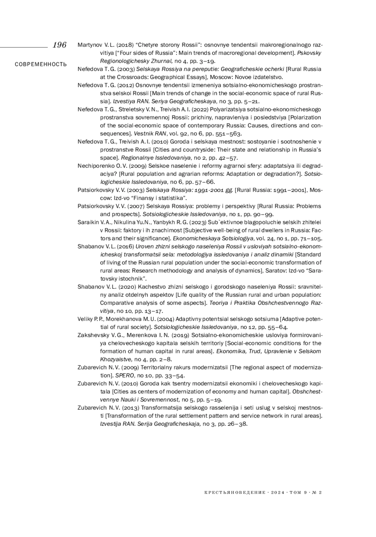 16. Нефёдова Т. Г. (2003). Сельская Россия на перепутье: Географические очерки / Российская академия наук. Институт географии. М.: Новое издательство. EDN: SUQARN