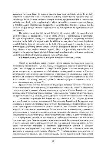 Авторами отмечено, что текущее определение транспортной безопасности оказывается неполным и требует пересмотра. Принимая во внимание все вышеизложенное, рекомендуется переформулировать законодательные положения, стремясь к более четкому признанию людей как первостепенных объектов защиты в сфере транспортной безопасности. Кроме того, анализ действующего законодательства выявил, что сфокусированность государственной политики в области транспортной безопасности преимущественно ориентирована на предотвращение и противодействие террористическим угрозам. Однако такой подход не охватывает все сферы рисков, актуальных для современной транспортной системы. Особенно заметен недостаток внимания к растущей опасности цифровых угроз, таких, как кибератаки, которые могут быть направлены против объектов транспортной инфраструктуры и самих транспортных средств.