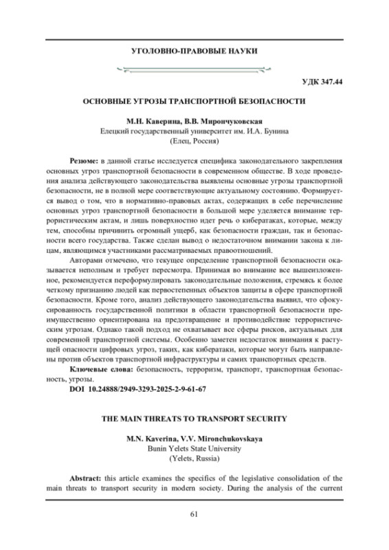 9. Челядинов Д.В., Полякова В.А. Угрозы транспортной безопасности Российской Федерации // ППД. - 2023. -№4 (54). - С. 69-72.