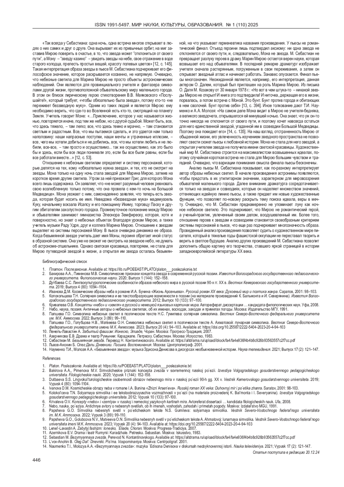8. Папшева Г.О. Символика небесных светил в поэтическом тексте Н.С. Гумилева: солярная символика. Вестник Северо-Восточного федерального университета им. М.К. Аммосова. 2022; Выпуск 3 (89): 99-110.