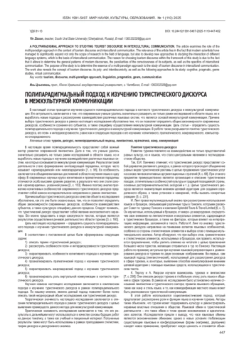 В настоящей статье проводится изучение сущности полипарадигмального подхода в контексте туристического дискурса и межкультурной коммуникации. Его актуальность заключается в том, что современным ученым удалось значительно расширить не только рамки исследований в области языка, но и выработать новые подходы к рассмотрению взаимодействия различных языковых систем, что является основой межкультурной коммуникации. Причина выбора туристического дискурса в рамках настоящего исследования обусловлена тем, что он позволяет определить общие закономерности современных дискурсов, особенности сознания его субъектов, а также специфику осуществления межкультурной коммуникации. Цель статьи - определить сущность полипарадигмального подхода к изучению туристического дискурса в межкультурной коммуникации. В работе также раскрывается понятие туристического дискурса, его поли- и интердискурсивности, равно как и следующих подходов к его изучению: когнитивного, прагматического, жанроведческого, компьютерно-опосредованного.