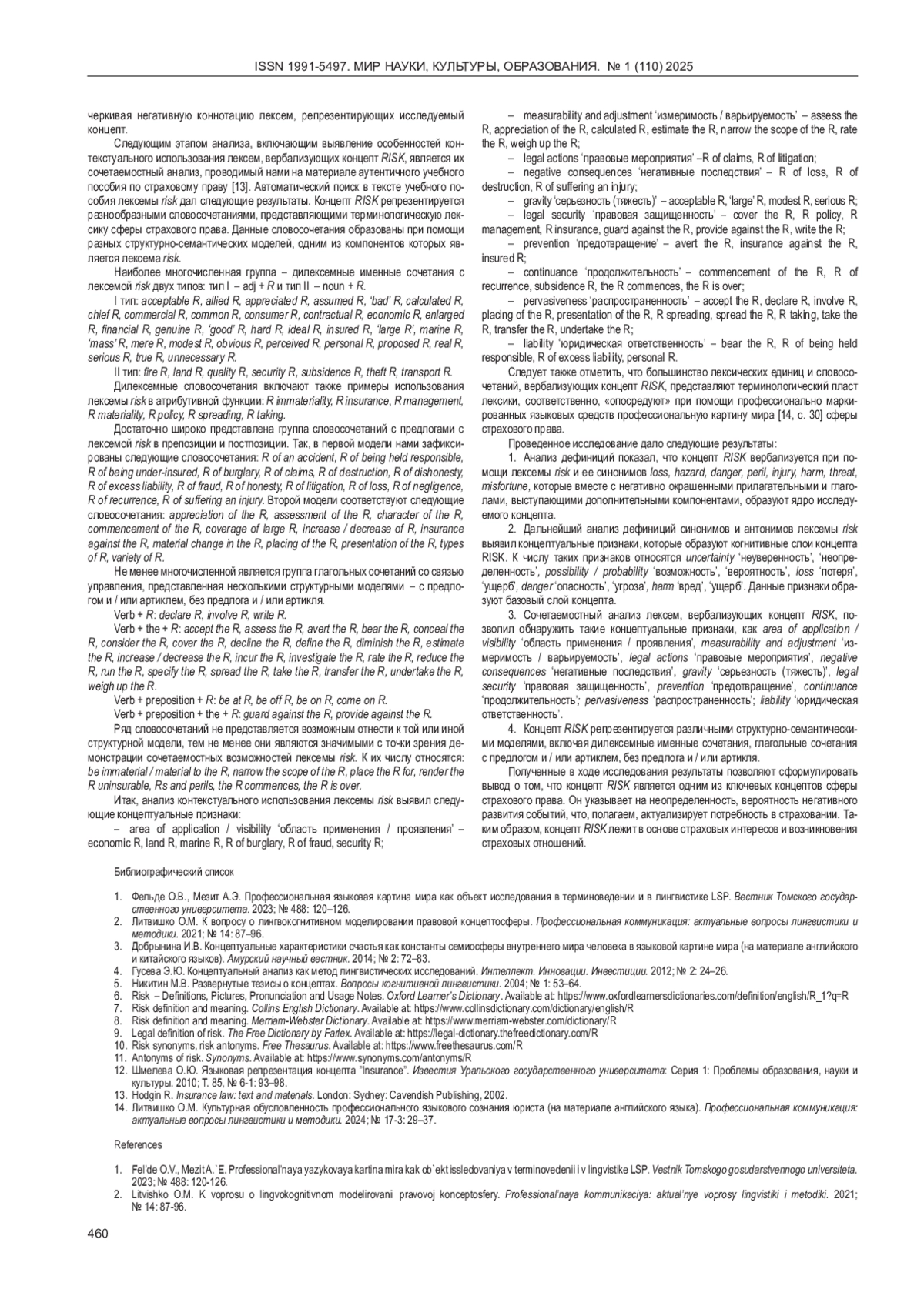 ЛИТВИШКО О. М., ЧЕРНОУСОВА Ю. А. КОНЦЕПТ RISK В АНГЛОЯЗЫЧНОЙ ПРОФЕССИОНАЛЬНОЙ КАРТИНЕ МИРА (НА МАТЕРИАЛЕ СТРАХОВОГО ПРАВА) // МИР НАУКИ, КУЛЬТУРЫ, ОБРАЗОВАНИЯ. 2025. № 1 (110)