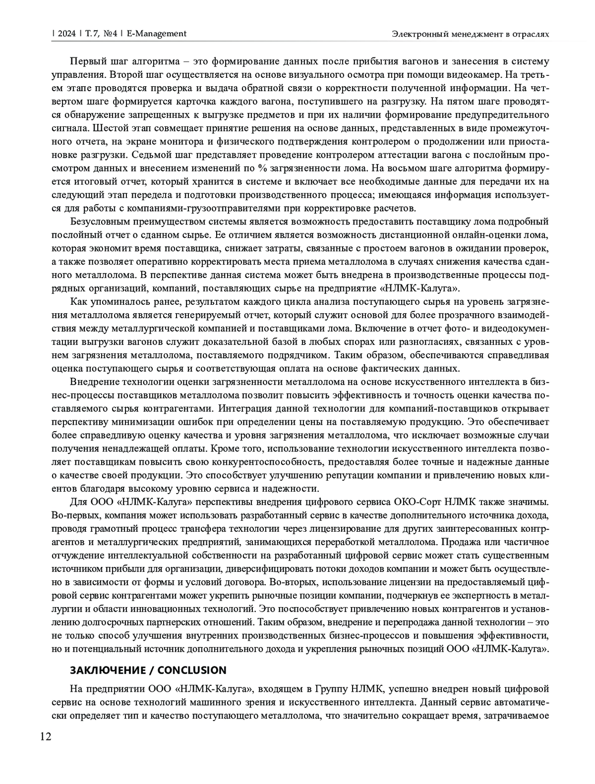 В настоящее время в отрасли черной металлургии наблюдаются растущие тенденции по показателю «ломообразование», что требует более ответственного отношения и эффективных способов в последующих переделах производственной цепочки. Приведены прогнозы развития рынка лома черных металлов в перспективе до 2030 г. Представлены факты о возрастающих тенденциях применения машинного зрения в промышленном секторе в результате проведения кластеризации ключевых слов «машинное зрение и промышленность» на основе публикаций, размещенных в базе данных NCBI PubMed. Объект исследования – предприятия металлургической отрасли, в частности по ломозаготовке черных металлов. Предмет исследования – процесс оценки засоренности лома. Проведено сравнение традиционного процесса оценки лома и цифрового (на основе применения машинного зрения), которые визуализированы в виде алгоритмов последовательности шагов их реализации. Подтверждена гипотеза о более эффективном использовании технологии машинного зрения в технологическом производственном процессе оценки засоренности металлолома при его приеме для дальнейшего передела по сравнению с технологией, основанной на визуально-экспертной оценке. Представлены перспективы использования и коммерциализации цифрового сервиса, а также его влияние на прозрачность и надежность взаимодействия между контрагентами. Использовались такие научные методы, как библиометрический анализ литературы, посвященный вопросам применяемых методов и способов оценки качества выгружаемого лома, сравнительный анализ применяемых процессов оценки засоренности лома на основе рассмотренных алгоритмов, а также методы синтеза, которые обобщают результаты.