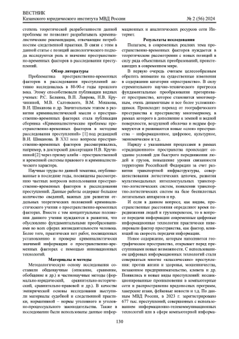 Обсуждение и заключение: автор пришел к выводу, что успешное расследование преступлений невозможно без учета пространственно-временных факторов. Необходимы дальнейшее развитие криминалистического учения о пространственно-временных факторах и подготовка на его основе криминалистических рекомендаций для следователей и оперативных сотрудников.