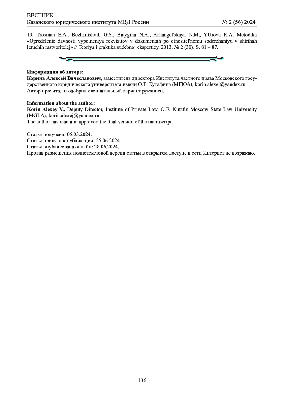 13. Тросман Э.А., Бежанишвили Г.С., Батыгина Н.А., Архангельская Н.М., Юрова Р.А. Методика “Определение давности выполнения реквизитов в документах по относительному содержанию в штрихах летучих растворителей” // Теория и практика судебной экспертизы. 2013. № 2 (30). С. 81 - 87. EDN: QYQQIT