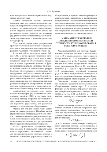 В данной работе проводится анализ forkjoin СМО с точки зрения управления оптимальным уровнем загрузки системы и, соответственно скорости обслуживания. Предлагается модель определения стоимости функционирования системы, зависящая от среднего времени отклика и цены единицы ресурса (скорости обслуживания), необходимых для поддержания требуемого качества обслуживания пользовательских запросов. С одной стороны, мы хотим уменьшить среднее время отклика системы, но с другой стороны, при этом расходы на скорость обслуживания не должны быть слишком велики, и важно найти оптимальный баланс между этими величинами.