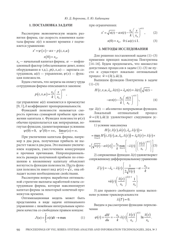 В статье проводится анализ экономической модели, описывающей динамику развития фирмы с управлением. Задача состоит в выработке оптимальной стратегии выплаты заработной платы сотрудникам фирмы, которая позволит увеличить объем капитала фирмы на некотором временном интервале. Модель построена на основе дифференциального уравнения первого порядка, связывающего динамику развития фирмы с функциями полезности и выплаты заработной платы. Функция, описывающая затраты, связанные с выплатой заработной платы сотрудникам, зависит от времени, совокупного капитала фирмы и параметра управляющего воздействия, принимающего значения на промежутке [0,1]. Она является адаптированной модификацией производственной функции Кобба - Дугласа, в которой в качестве капитала используется совокупный капитал фирмы, а в качестве трудовых ресурсов - начальный капитал фирмы. Оптимизационная модель представлена в виде задачи оптимального управления со свободным правым концом. В данной постановке модель, является новой и в литературе ранее не рассматривалась. Для её решения был применён принцип максимума Понтрягина. В работе исследовано три случая задания оптимального управления как кусочно-постоянной функции на всём временном отрезке: управление равное нулю, управление равное единице, и принимающее произвольное значение из интервала [0, 1]. Это позволило сравнить две стратегии выплаты заработной платы: постоянную и пропорциональную капиталу фирмы. Проведённые исследования показали, что выбор оптимального управления зависит от соотношения между инфляционным фактором, коэффициентом пропорциональности и начальным капиталом фирмы. Были получены условия, когда выплата заработной платы сотрудникам должна происходить на постоянном уровне, в противном случае следует устанавливать зарплату пропорционально капиталу фирмы. Так как в случае не выполнении условий, выплата заработной платы на постоянном уровне приводит либо к полному разорению фирмы либо уровень капитала падает до более низкого уровня. В работе получены условия возникновения стационарных решений, когда при любом управлении капитал фирмы останется на уровне начального капитала. Частично результаты исследований были представлены на конференциях [1, 2].