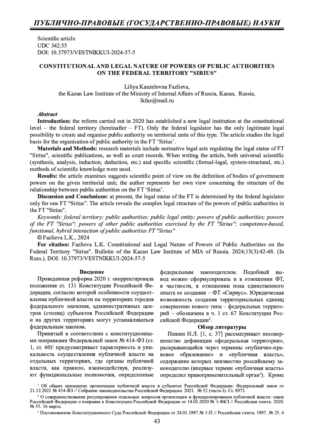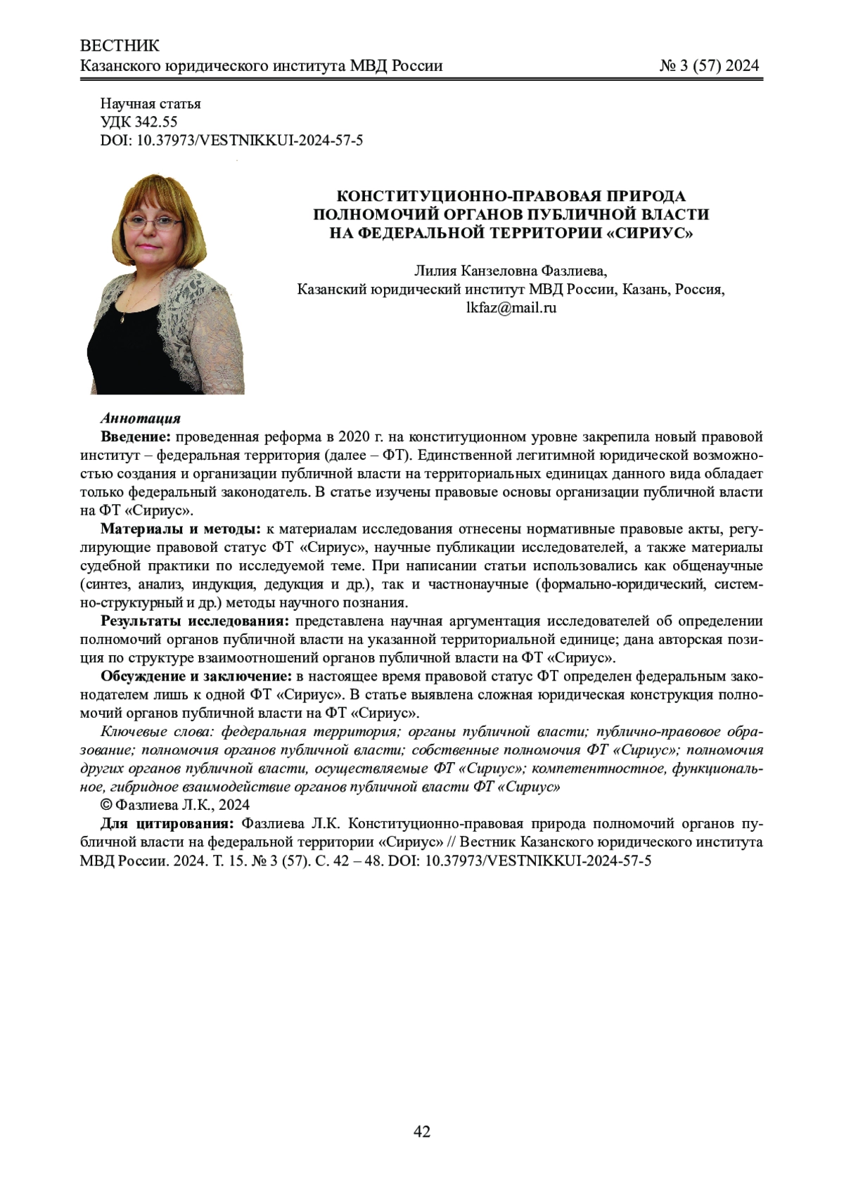 ФАЗЛИЕВА Л. К. КОНСТИТУЦИОННО-ПРАВОВАЯ ПРИРОДА ПОЛНОМОЧИЙ ОРГАНОВ ПУБЛИЧНОЙ ВЛАСТИ НА ФЕДЕРАЛЬНОЙ ТЕРРИТОРИИ "СИРИУС" // ВЕСТНИК КАЗАНСКОГО ЮРИДИЧЕСКОГО ИНСТИТУТА МВД РОССИИ. 2024. Т. 15 № 3 (57)
