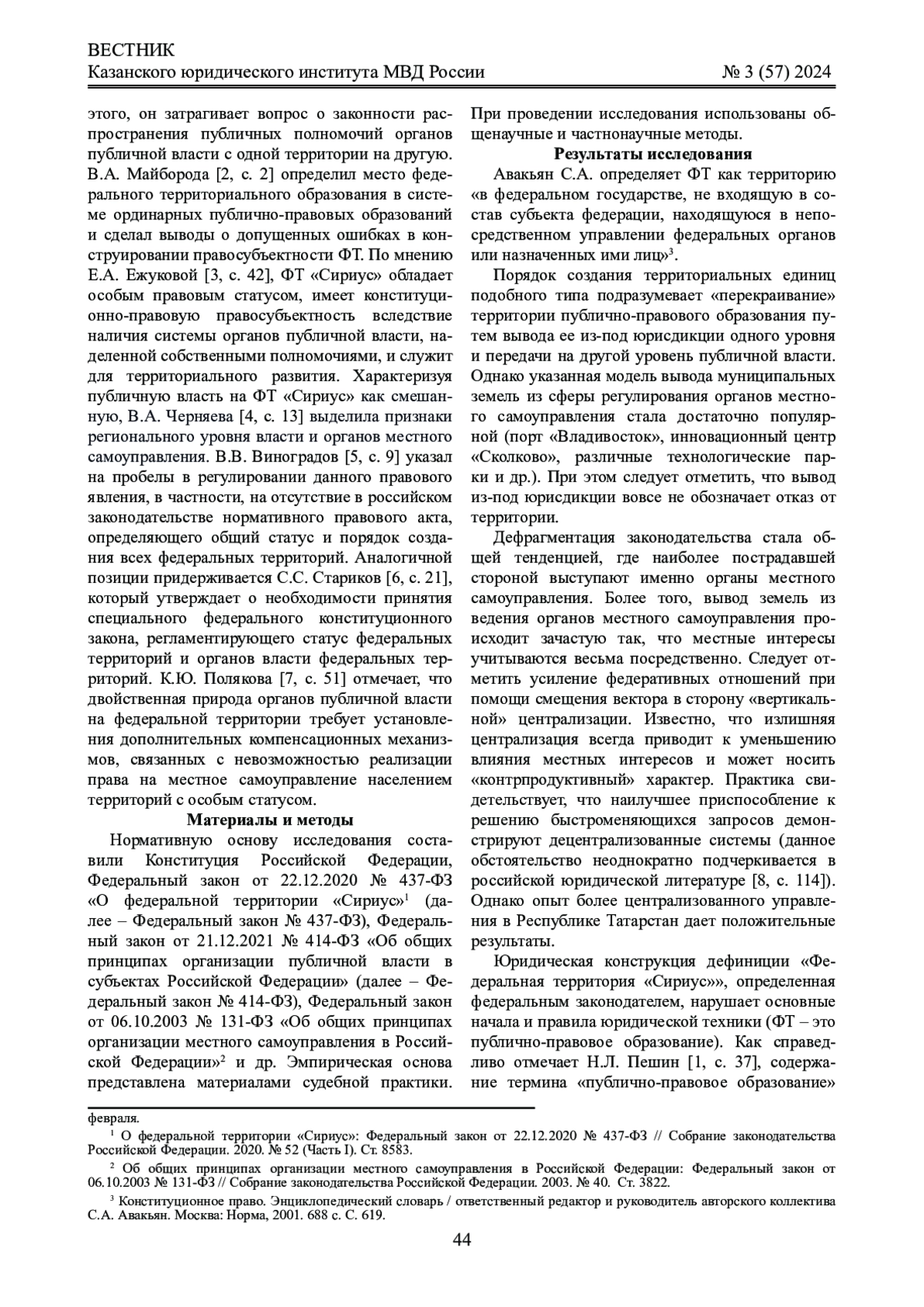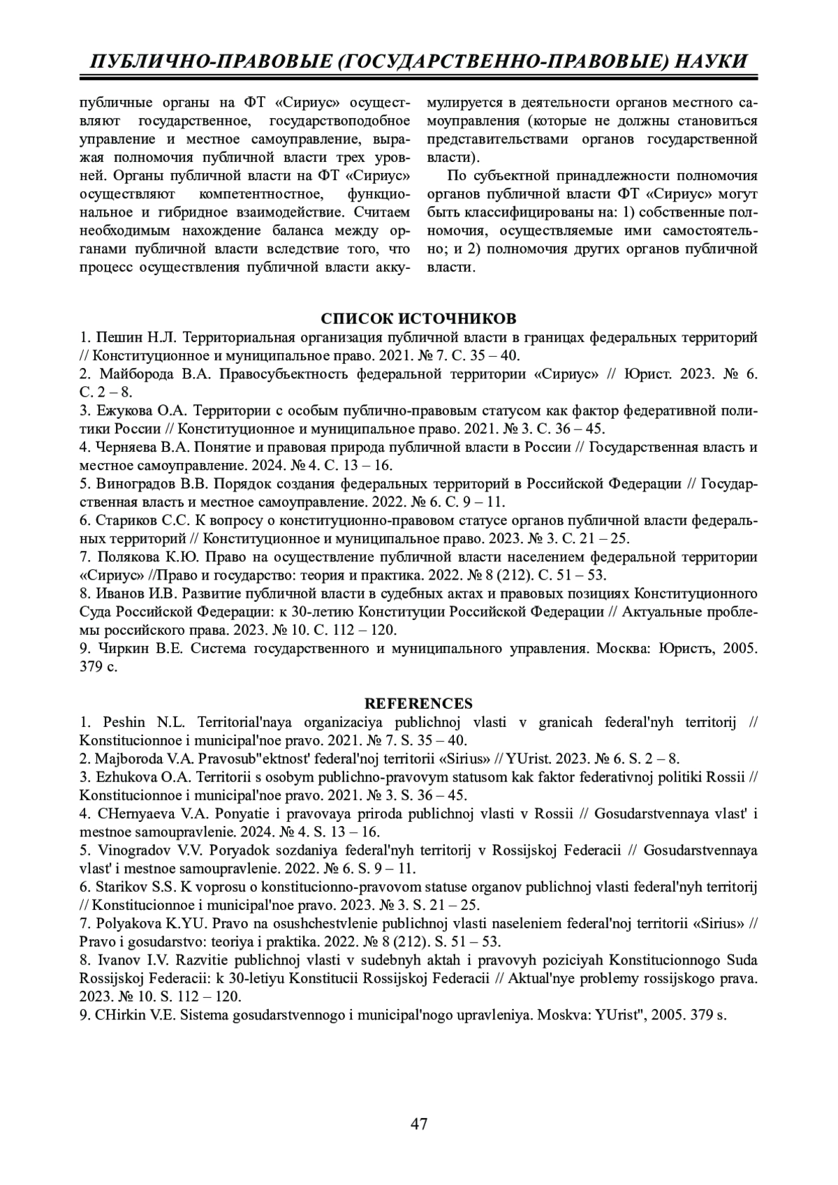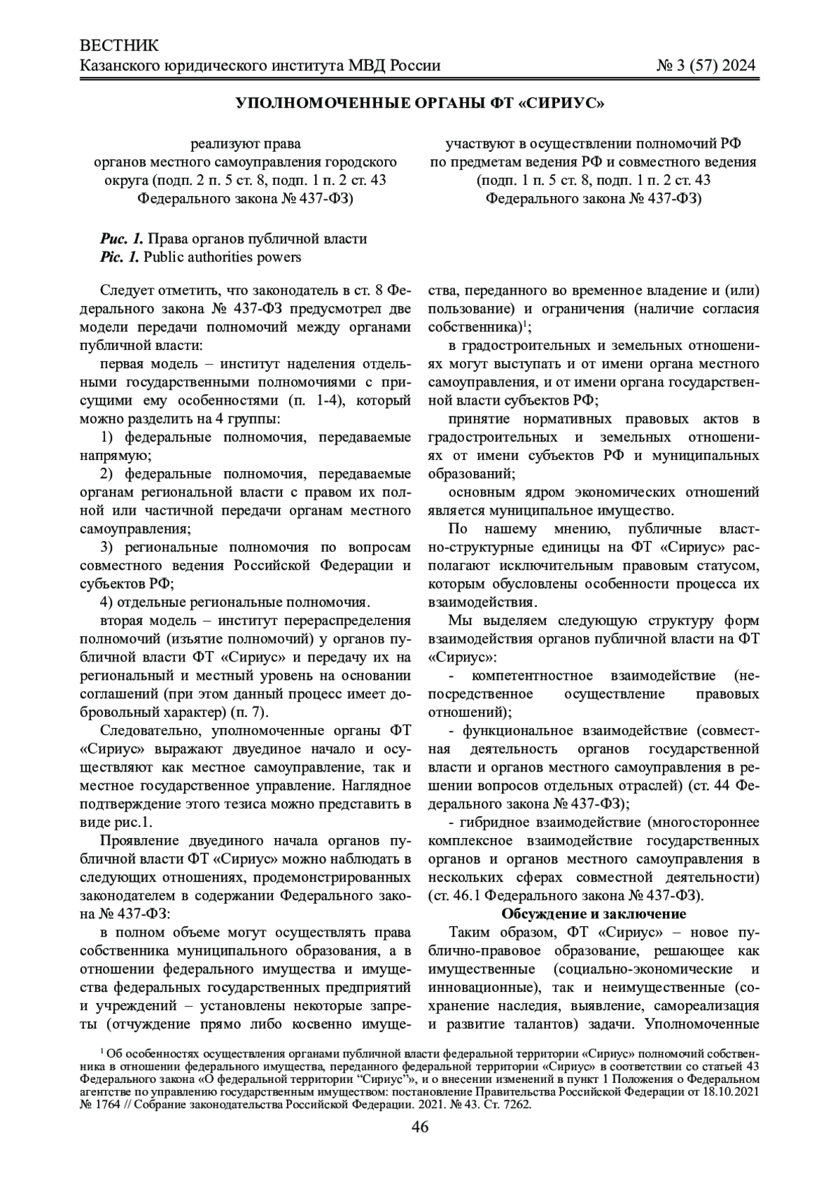 Статья: КОНСТИТУЦИОННО-ПРАВОВАЯ ПРИРОДА ПОЛНОМОЧИЙ ОРГАНОВ ПУБЛИЧНОЙ ВЛАСТИ НА ФЕДЕРАЛЬНОЙ ТЕРРИТОРИИ "СИРИУС" (2024)