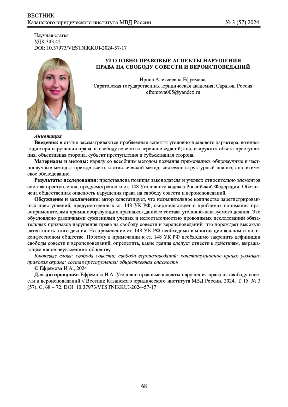 2. Арямов А.А., Руева Е.О., Пономаренко В.С. Вариация на тему уголовно-правовой охраны свободы вероисповедания в Российской Федерации // Известия высших учебных заведений. Уральский регион. 2014. № 3. С. 4-16. EDN: TETZJD