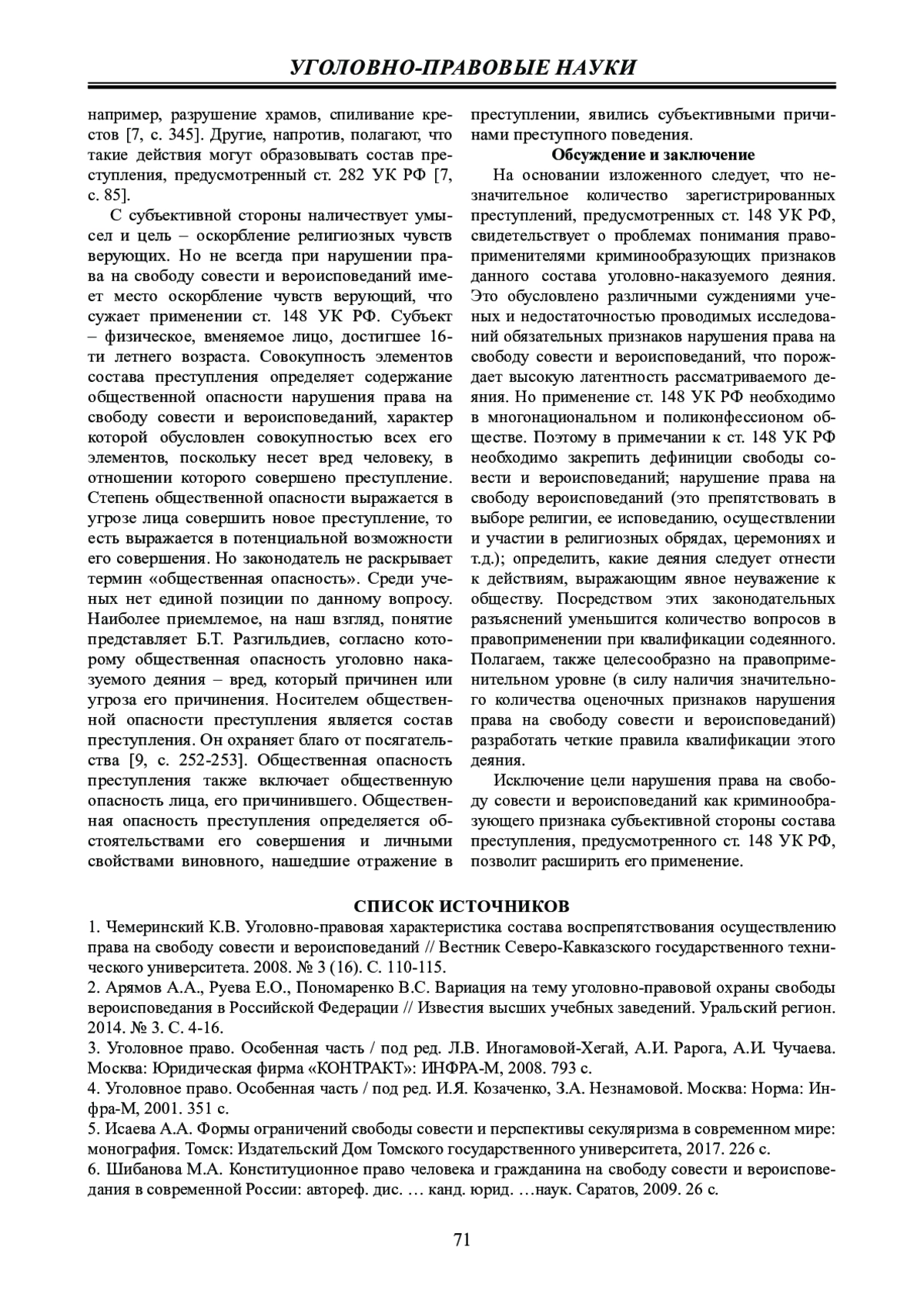 1. Чемеринский К.В. Уголовно-правовая характеристика состава воспрепятствования осуществлению права на свободу совести и вероисповеданий // Вестник Северо-Кавказского государственного технического университета. 2008. № 3 (16). С. 110-115.