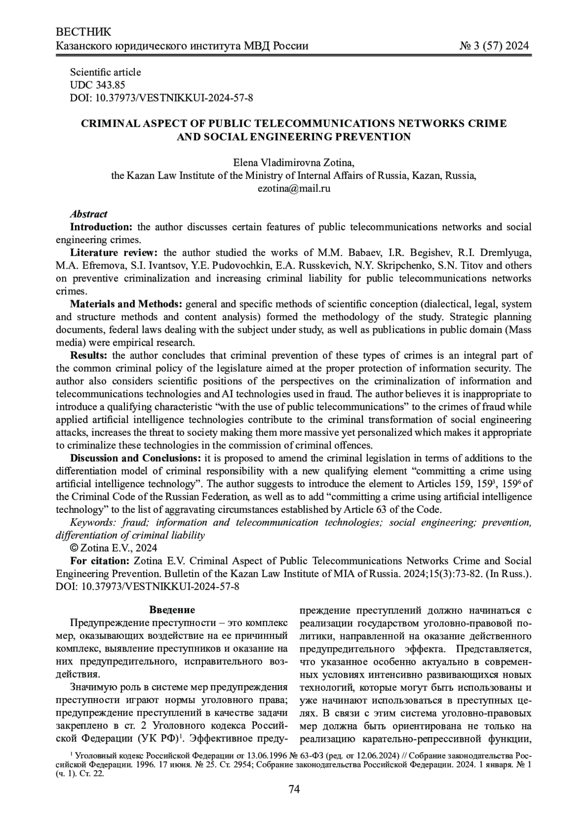 12. Скрипченко Н.Ю. Использование информационно-телекоммуникационных сетей в криминальных целях: нормативный учет и перспективы расширения уголовно-правового значения // Вестник РУДН. Серия Юридические науки. 2024. Т. 28. № 1. С. 196 - 214. EDN: QXGMAB