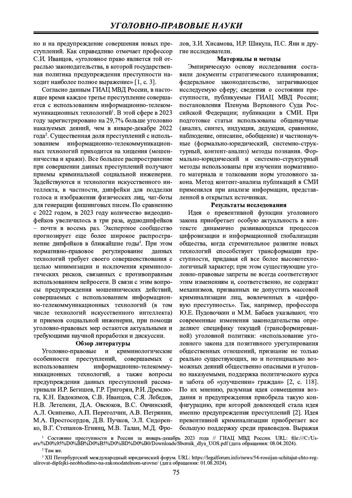 Обзор литературы: изучены труды М. М. Бабаева, И. Р. Бегишева, Р. И. Дремлюги, М. А. Ефремовой, С. И. Иванцова, Ю. Е. Пудовочкина, Е. А. Русскевича, Н. Ю. Скрипченко, С. Н. Титова и других ученых, посвященные вопросам превентивной криминализации и ужесточения уголовной ответственности за преступления, совершаемые с использованием информационно-телекоммуникационных технологий.