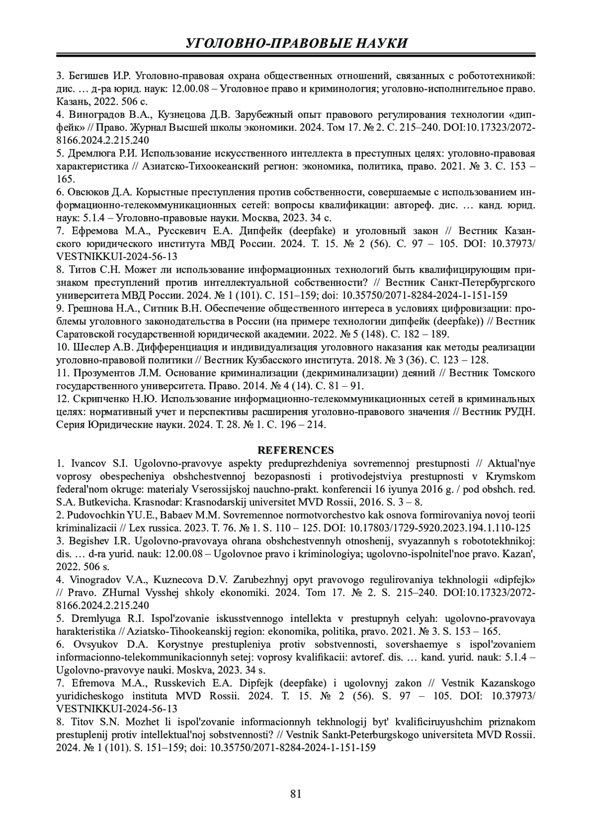 7. Ефремова М.А., Русскевич Е.А. Дипфейк (deepfake) и уголовный закон // Вестник Казанского юридического института МВД России. 2024. Т. 15. № 2 (56). С. 97 - 105. DOI: 10.37973/VESTNIKKUI-2024-56-13 EDN: LXAWLM