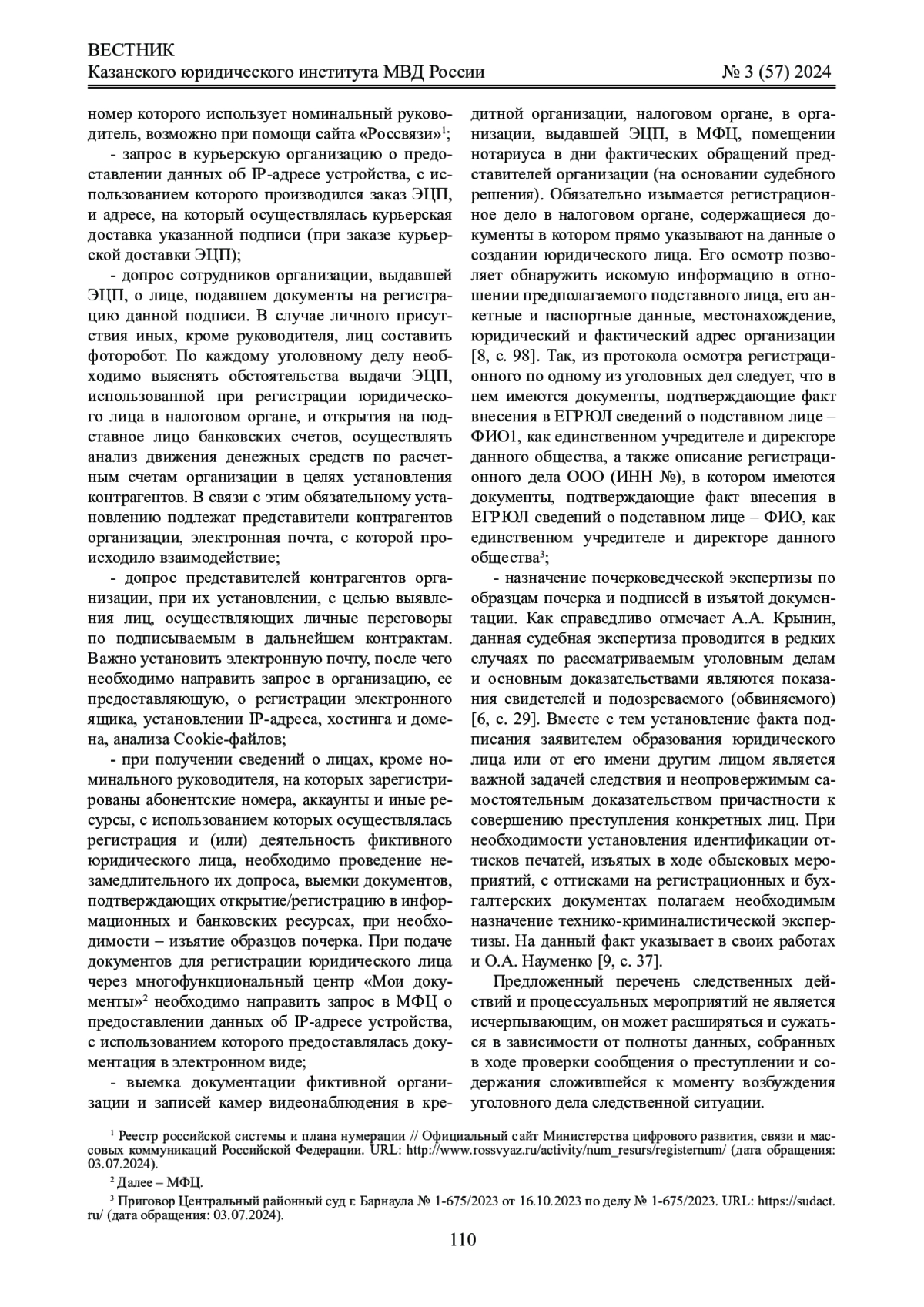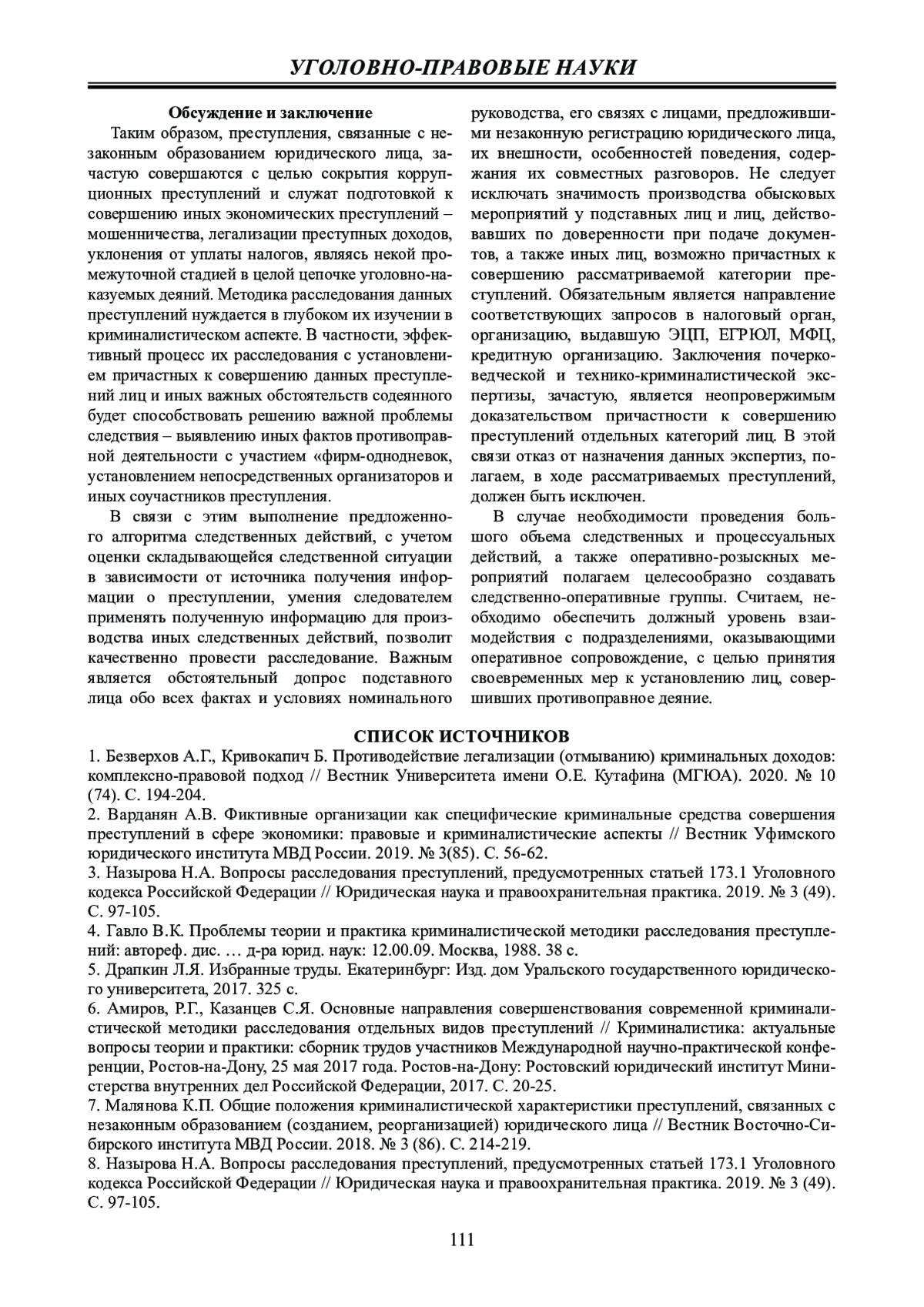 2. Варданян А.В. Фиктивные организации как специфические криминальные средства совершения преступлений в сфере экономики: правовые и криминалистические аспекты // Вестник Уфимского юридического института МВД России. 2019. № 3(85). С. 56-62. EDN: EMOUQE