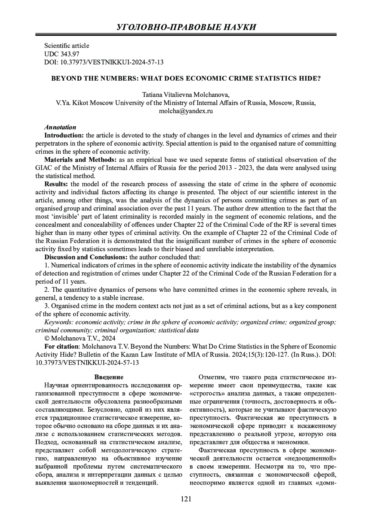 2. Молчанова Т.В. Трудности статистической интерпретации преступности // Вестник Казанского юридического института МВД России. 2023. T. 14. № 2 (52). С. 90-97. DOI: 10.37973/KUI.2023.27.17.013 EDN: NICXAK