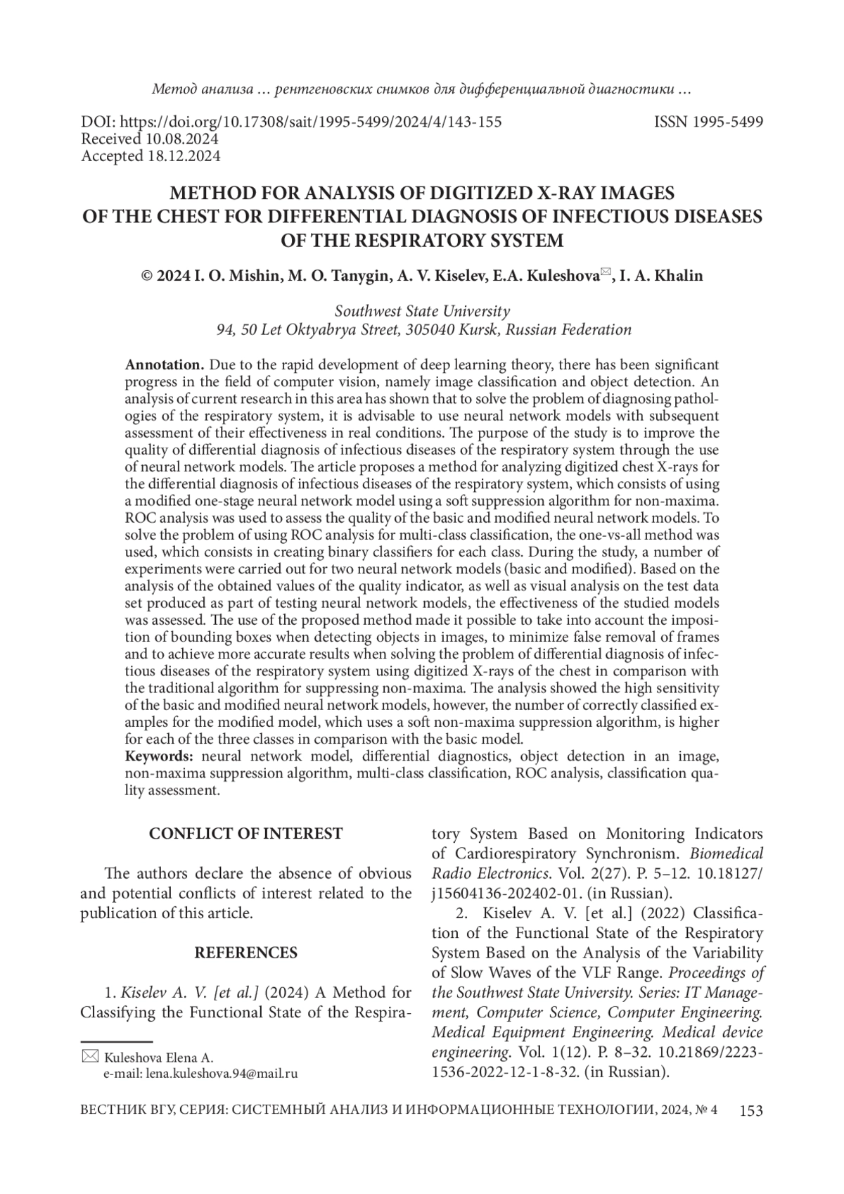 В связи со стремительным развитием теории глубокого обучения наблюдается значительный прогресс и в области компьютерного зрения, а именно классификации изображений и обнаружения объектов. Анализ актуальных исследований в данной области показал, что для решения задачи диагностики патологий дыхательной системы целесообразно применение нейросетевых моделей с последующей оценкой их эффективности в реальных условиях. Целью исследования является повышение качества дифференциальной диагностики инфекционных заболеваний дыхательной системы за счет применения нейросетевых моделей. В статье предложен метод анализа оцифрованных рентгеновских снимков грудной клетки для дифференциальной диагностики инфекционных заболеваний дыхательной системы, заключающийся в применении модифицированной одноэтапной нейросетевой модели, использующей алгоритм мягкого подавления немаксимумов. Для оценки качества базовой и модифицированной нейросетевых моделей применялся ROC-анализ. Для решения задачи применения ROC-анализа для многоклассовой классификации был применен метод one-vs-all, заключающийся в создании бинарных классификаторов для каждого класса. В ходе исследования проведен ряд экспериментов для двух нейросетевых моделей (базовой и модифицированной). На основе анализа полученных значений показателя качества, а также визуального анализа на тестовом наборе данных, произведенного в рамках тестирования нейросетевых моделей, проведена оценка эффективности исследуемых моделей. Использование предложенного метода позволило учесть наложение ограничительных рамок при обнаружении объектов на изображениях, минимизировать ложное удаление рамок и достичь более точных результатов при решении задачи дифференциальной диагностики инфекционных заболеваний дыхательной системы по оцифрованным рентгеновским снимкам грудной клетки в сравнении с традиционным алгоритмом подавления немаксимумов. Проведенный анализ показал высокую чувствительность базовой и модифицированной нейросетевых моделей, однако количество правильно классифицированных примеров для модифицированной модели, использующей алгоритм мягкого подавления немаксимумов, выше для каждого из трех классов в сравнении базовой моделью.