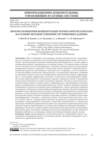 Работа посвящена использованию методов математического моделирования как основного инструмента исследований функционирования водных экосистем, а именно прогнозирования изменения концентрации фитопланктона в летний период в мелководном водоеме с применением спутниковых данных. Системный подход на основе синтеза математического моделирования с методами усвоения данных дистанционного зондирования позволил выполнить комплексный анализ динамики изменения биогео-химических процессов, протекающих в пространстве и во времени, с учетом совокупного действия физико-химических, биологических и антропогенных факторов, влияющих на изучаемую водную экосистему. Разработанная математическая модель, коррелирующая со спутниковой информацией, позволяет осуществлять прогнозирование поведения летнего фитопланктона в мелководном водоеме, изменения плотности выделенных планктонных популяций в условиях ускоренного времени, описывать окислительно-восстановительные процессы водной среды, сульфатредукции, трансформации биогенных веществ (минерального питания фитопланктона), изучать развитие заморных явлений, возникающих в результате антропогенной эвтрофикации, строить прогнозы изменения кислородного и биогенного режимов функционирования водоема. Для прогнозирования поведения летнего фитопланктона построен и реализован исследовательско-прогнозный комплекс, а также алгоритм его взаимодействия с ГИС. Разработанный программно-алгоритмический аппарат позволяет оценивать масштабы развития стихийных катаклизмов (эвтрофирования, «цветения», загрязнение водных систем различной этиологии и пр.), но и строить кратко- и среднесрочные прогнозы их развития в ускоренном времени для дальнейшего предотвращения негативных последствий экономического и социального характеров. Разработан оперативный алгоритм восстановления параметров качества вод Азовского моря, которой базируется на методе многомерной оптимизации Левенберга - Марквардта. В качестве входных данных использовано пространственное распределение фитопланктонных популяций, являющееся результатом применения метода локальных бинарных шаблонов к спутниковым снимкам, полученным авторами данного метода