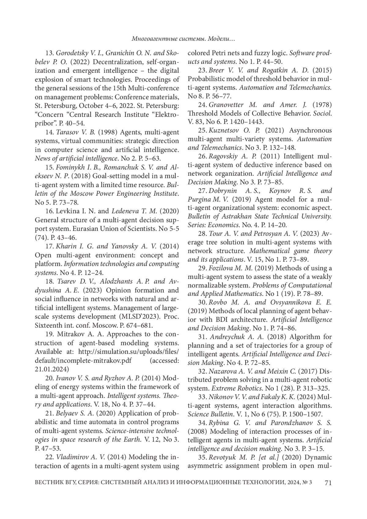 3. Городецкий В. И. Современное состояние и перспективы индустриальных применений многоагентных систем / В. И. Городецкий, О. Л. Бухвалов, П. О. Скобелев // Управление большими системами, 2017. - № 66. -С. 94-157. EDN: YZAKOV