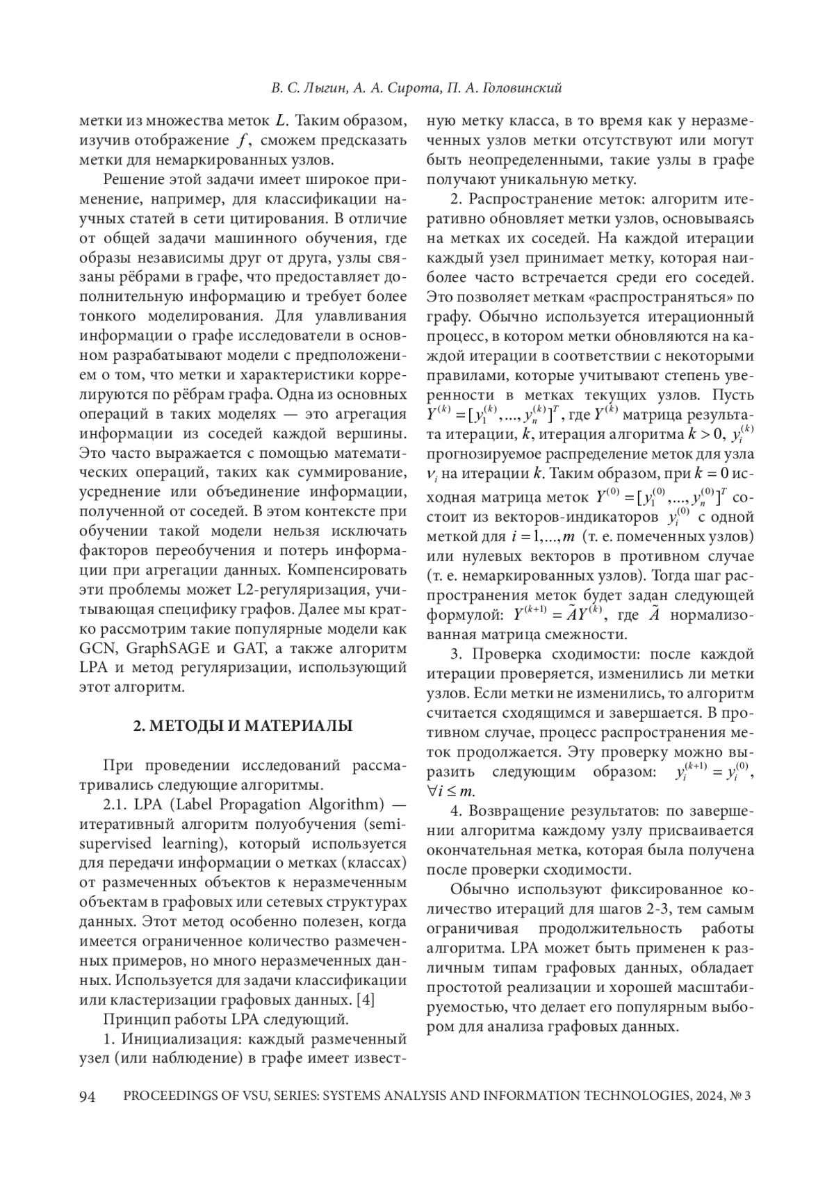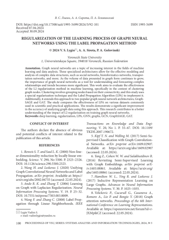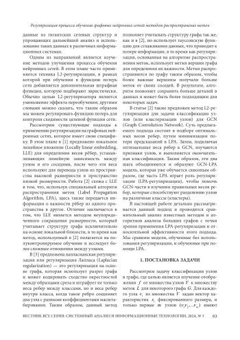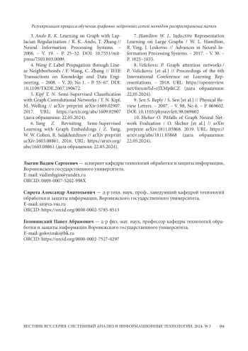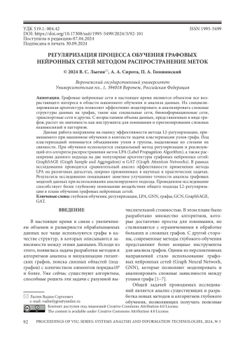 ГОЛОВИНСКИЙ П. А., СИРОТА А. А., ЛЫГИН В. С. РЕГУЛЯРИЗАЦИЯ ПРОЦЕССА ОБУЧЕНИЯ ГРАФОВЫХ НЕЙРОННЫХ СЕТЕЙ МЕТОДОМ РАСПРОСТРАНЕНИЕ МЕТОК // ВЕСТНИК ВОРОНЕЖСКОГО ГОСУДАРСТВЕННОГО УНИВЕРСИТЕТА. СЕРИЯ: СИСТЕМНЫЙ АНАЛИЗ И ИНФОРМАЦИОННЫЕ ТЕХНОЛОГИИ. 2024. № 3
