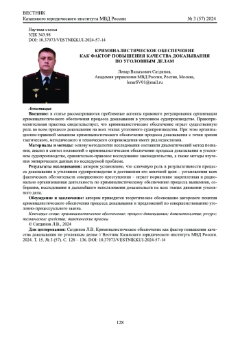 Обсуждение и заключение: автором приводится теоретическое обоснование авторского понятия криминалистического обеспечения процесса доказывания и предложений по совершенствованию уголовно-процессуального закона.