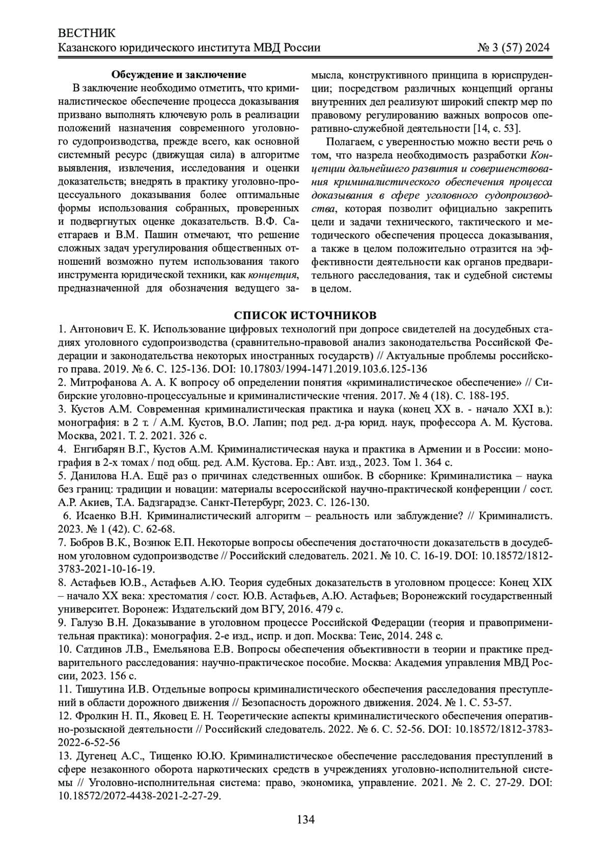 7. Бобров В.К., Вознюк Е.П. Некоторые вопросы обеспечения достаточности доказательств в досудебном уголовном судопроизводстве // Российский следователь. 2021. № 10. С. 16-19. DOI: 10.18572/1812-3783-2021-10-16-19 EDN: LYQTLG