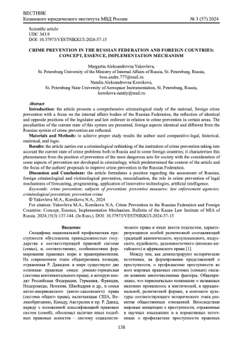 Результаты исследования: в статье осуществлено криминологическое переосмысление институции профилактики преступности с учетом современного состояния проблем с преступностью как в России, так и в отдельных зарубежных странах; охарактеризован данный феномен с позиции профилактики наиболее опасных для общества деяний с рассмотрением некоторых не разработанных в криминологии аспектов профилактики, что предопределило содержание статьи и направленность предложений авторов по совершенствованию профилактики преступности в Российской Федерации.