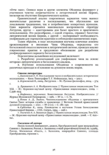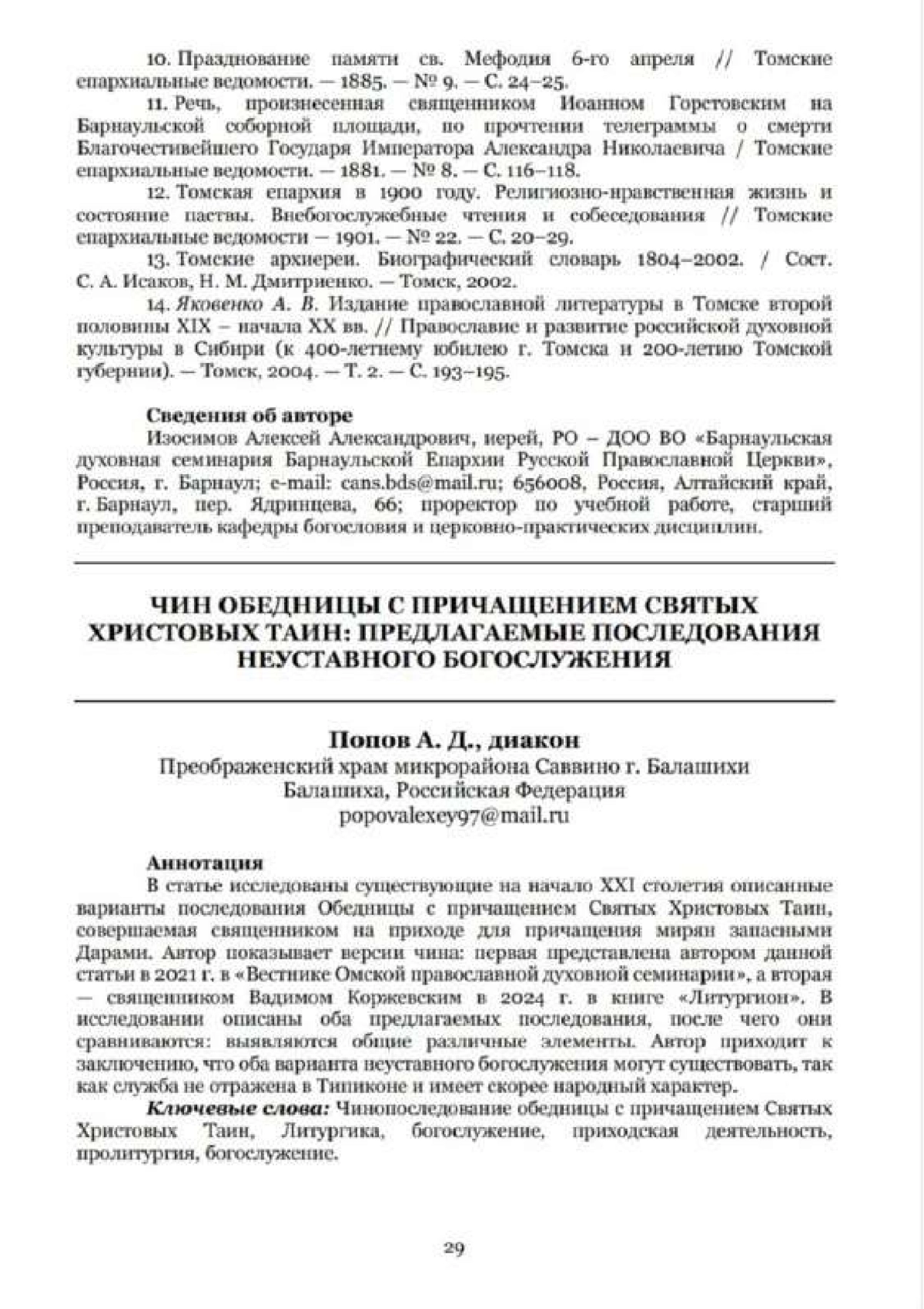 Попов А.Д., диак. Чин обедницы с причащением Святых Христовых Таин: предлагаемые последования неуставного богослужения // Труды Барнаульской духовной семинарии. - 2025. - №15. - С.29-36.